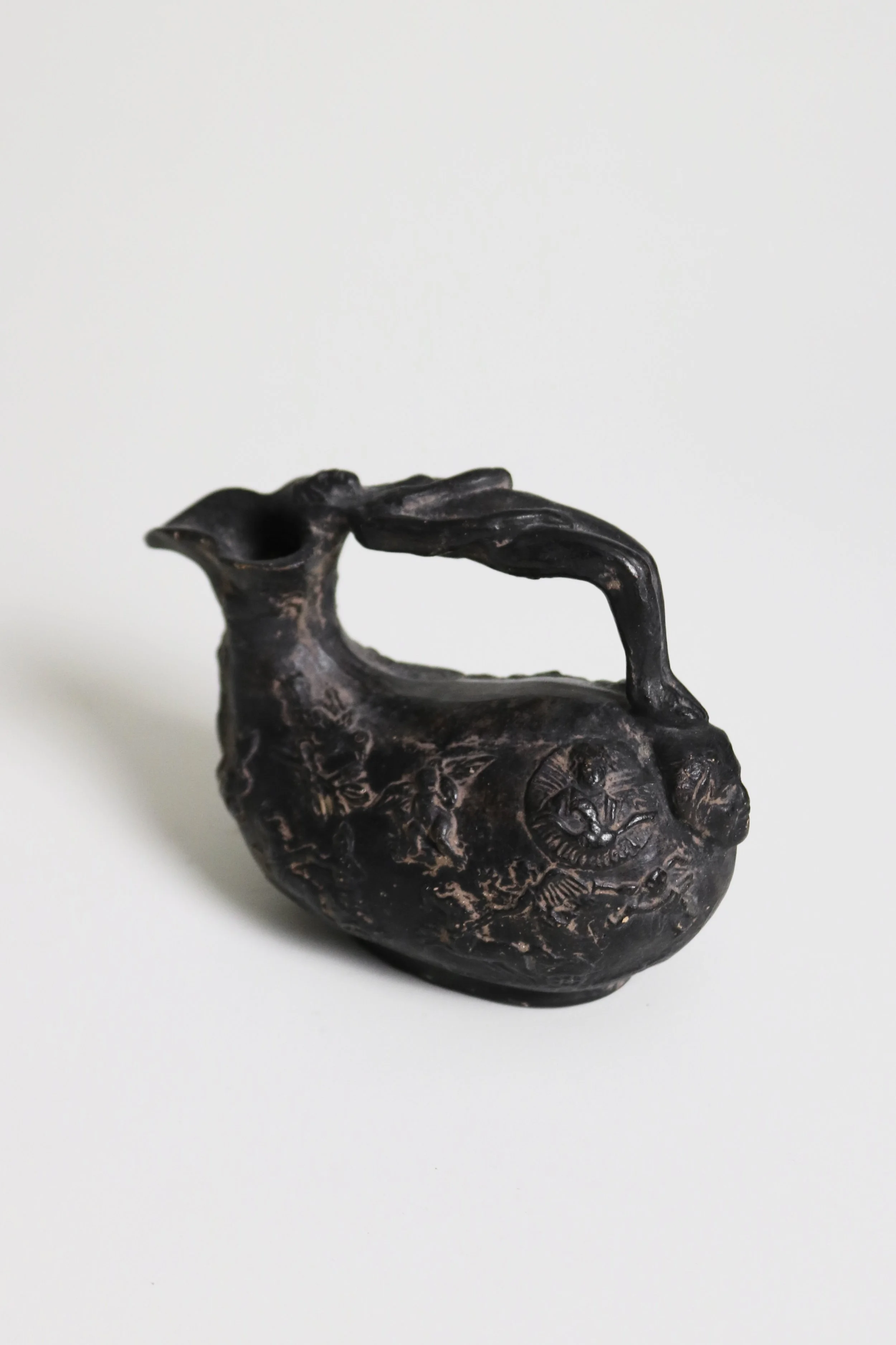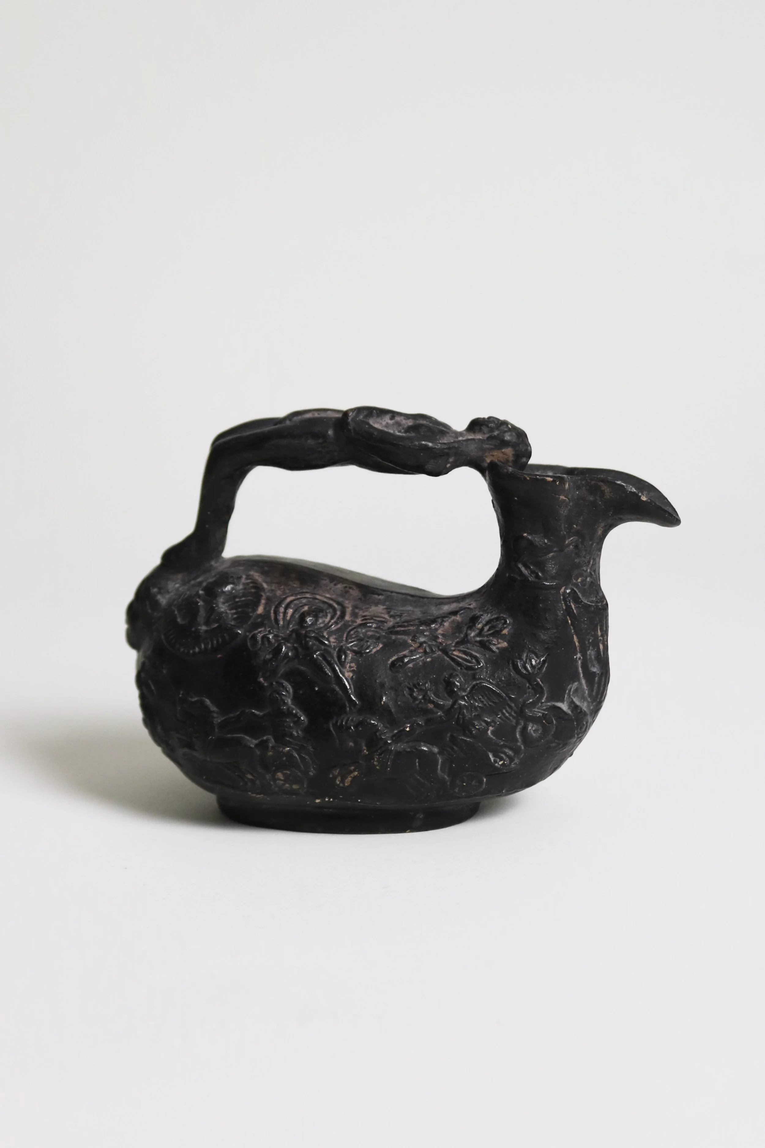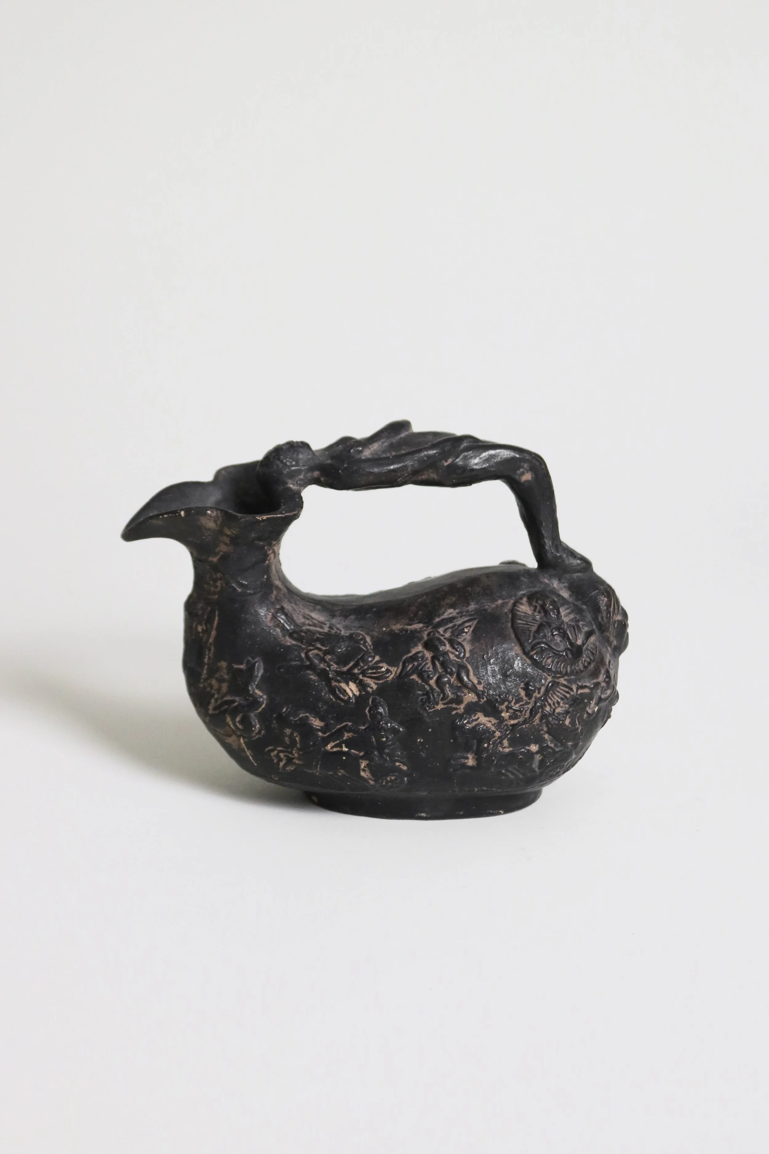 A ceramic replica of an ancient Roman poring jug depicting mythological scenes. Produced as a souvenir for people travelling the Grand Tour in the 19th century.