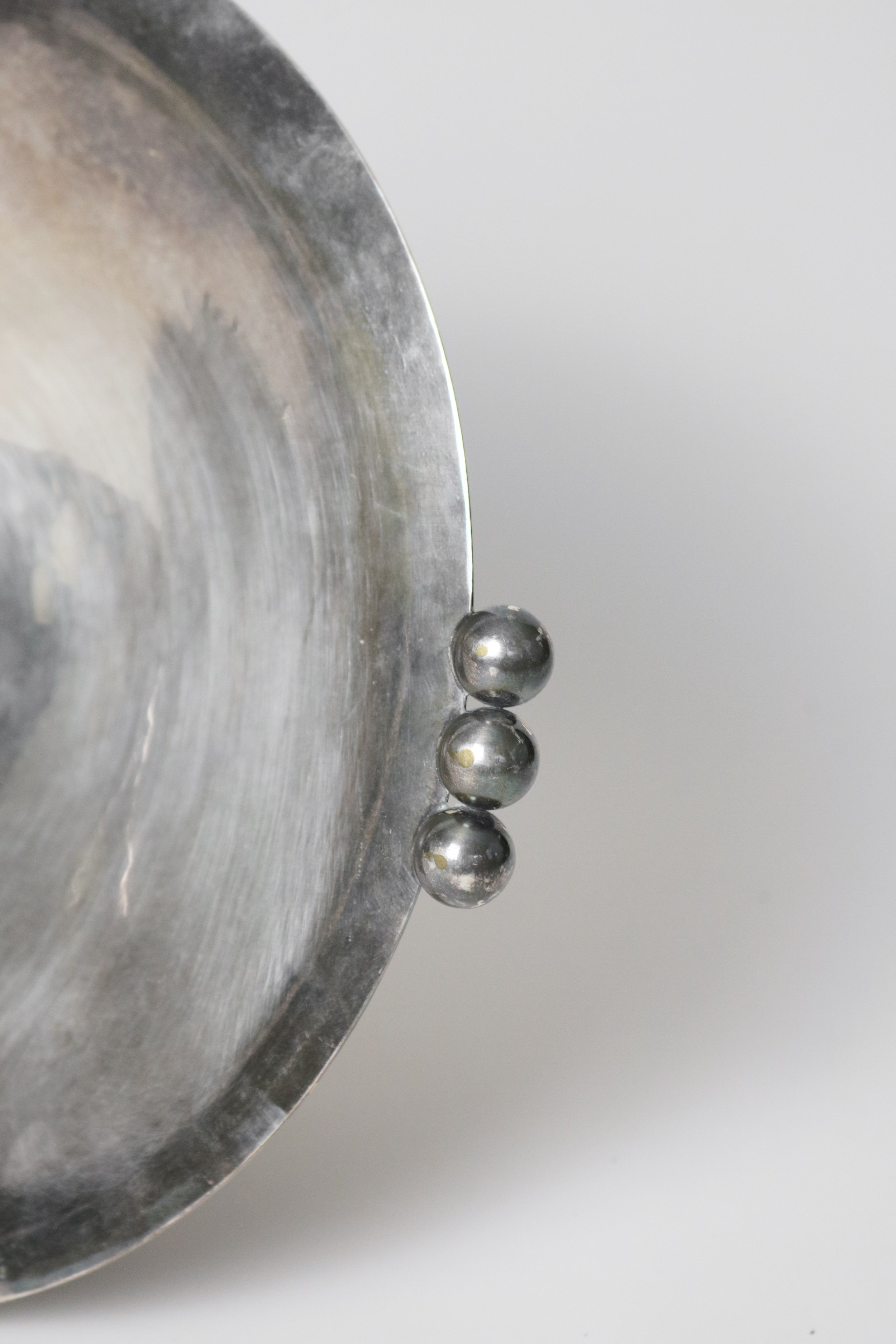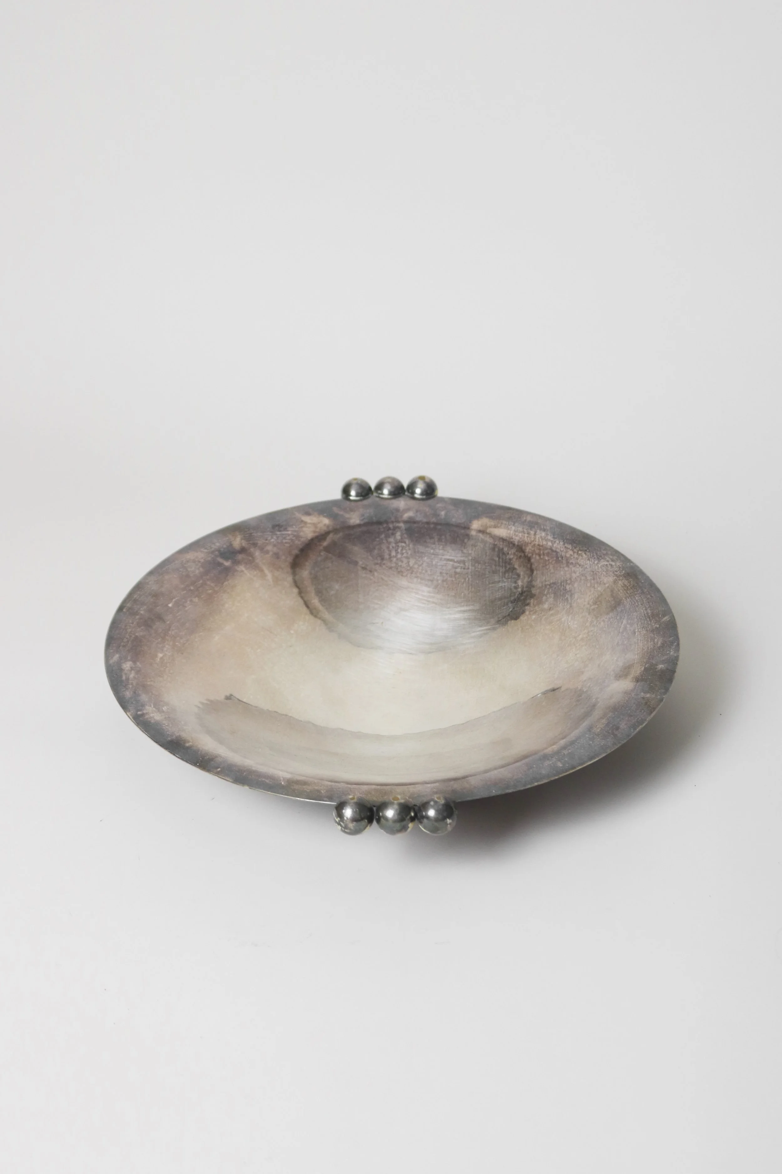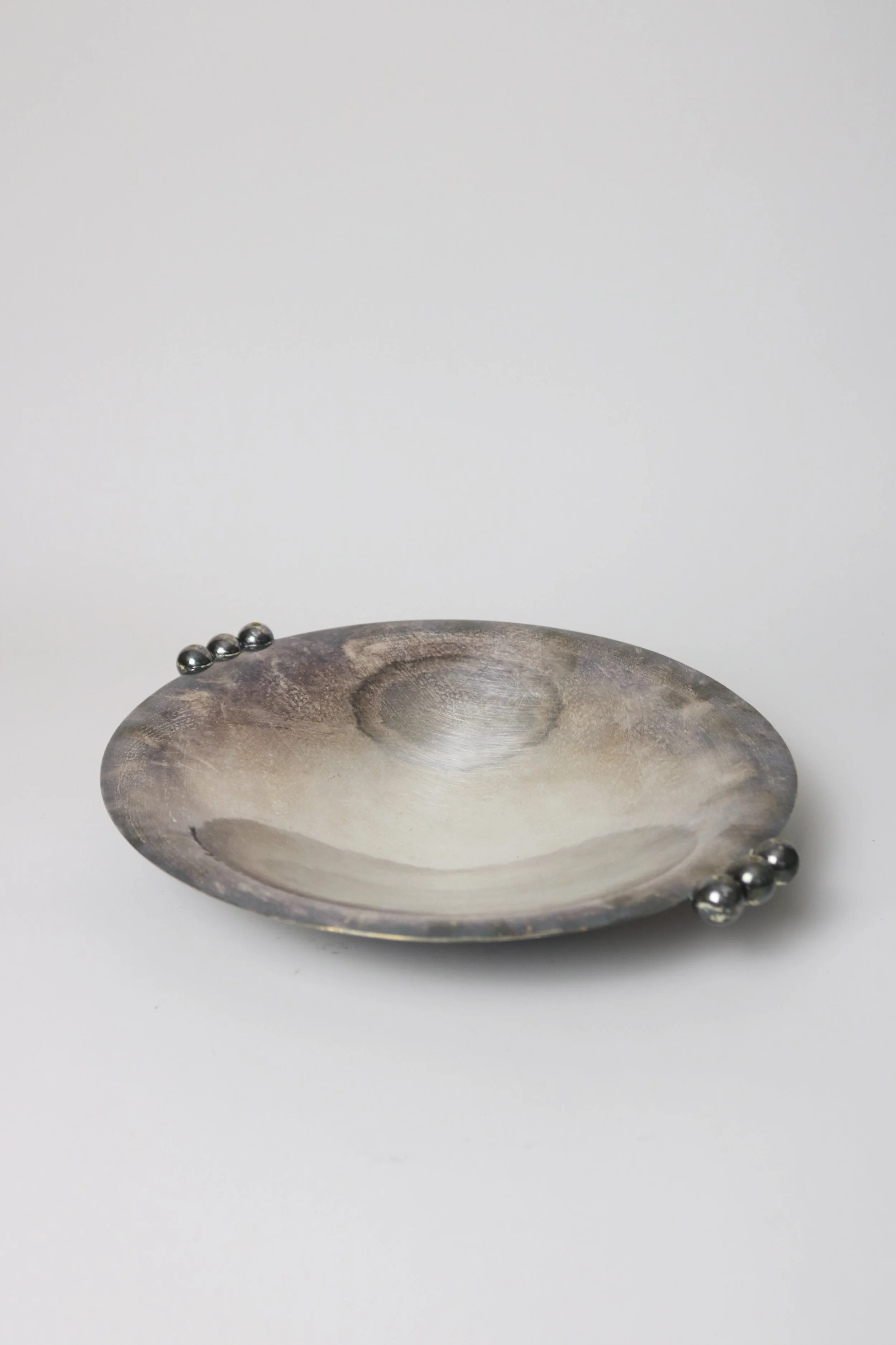 A tarnished silver platter with balled handles and a shallow brushed bowl.