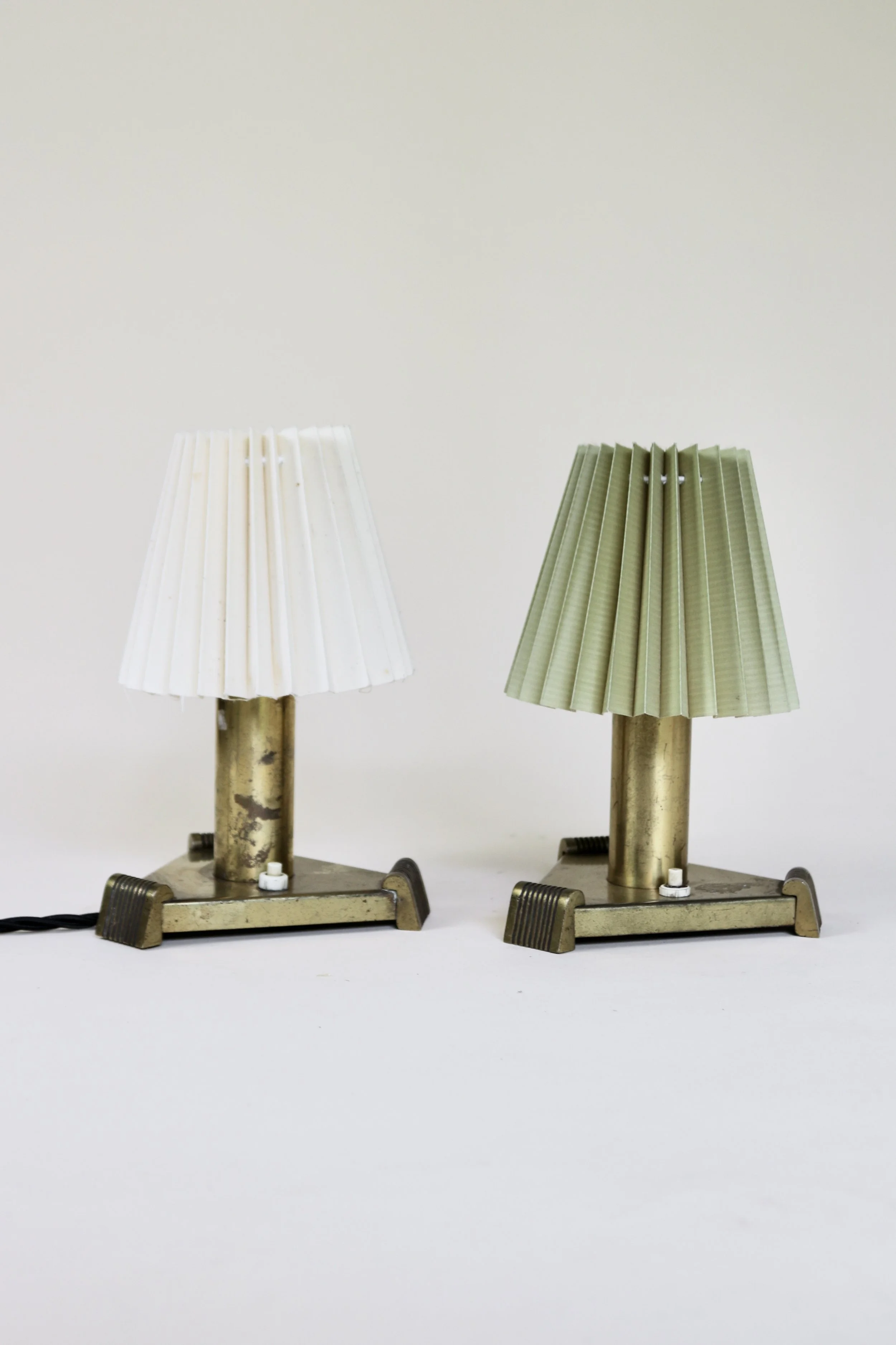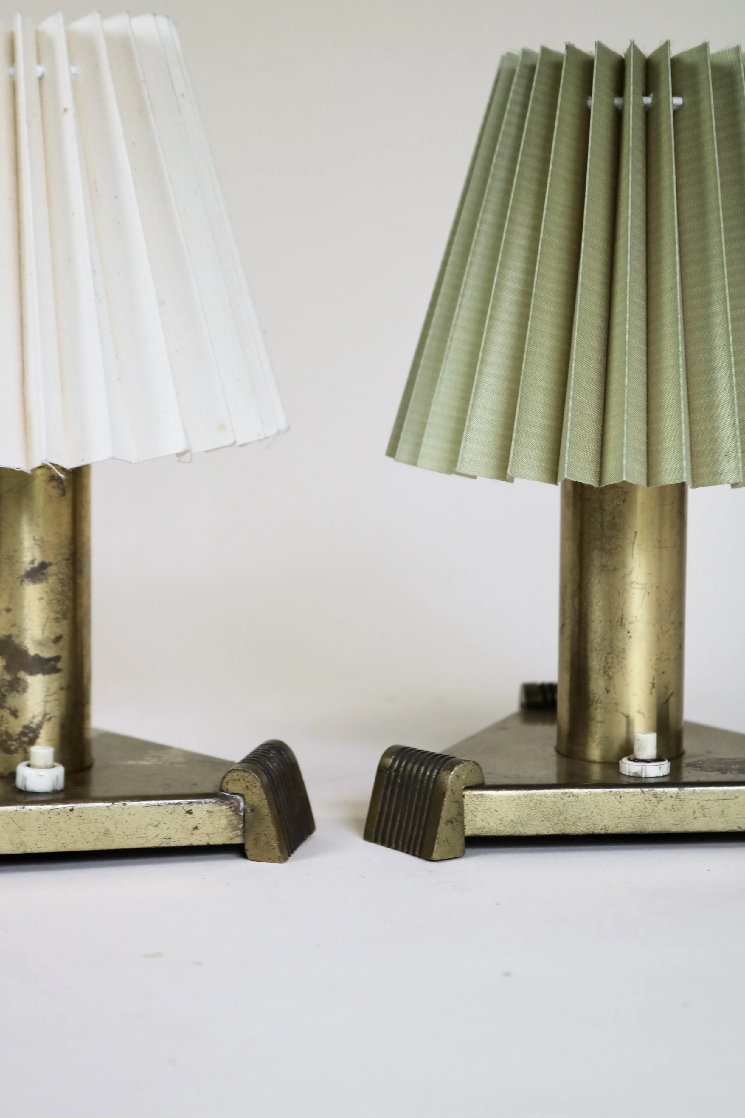A small pair of brass lamps with pleated odd-coloured lampshades.