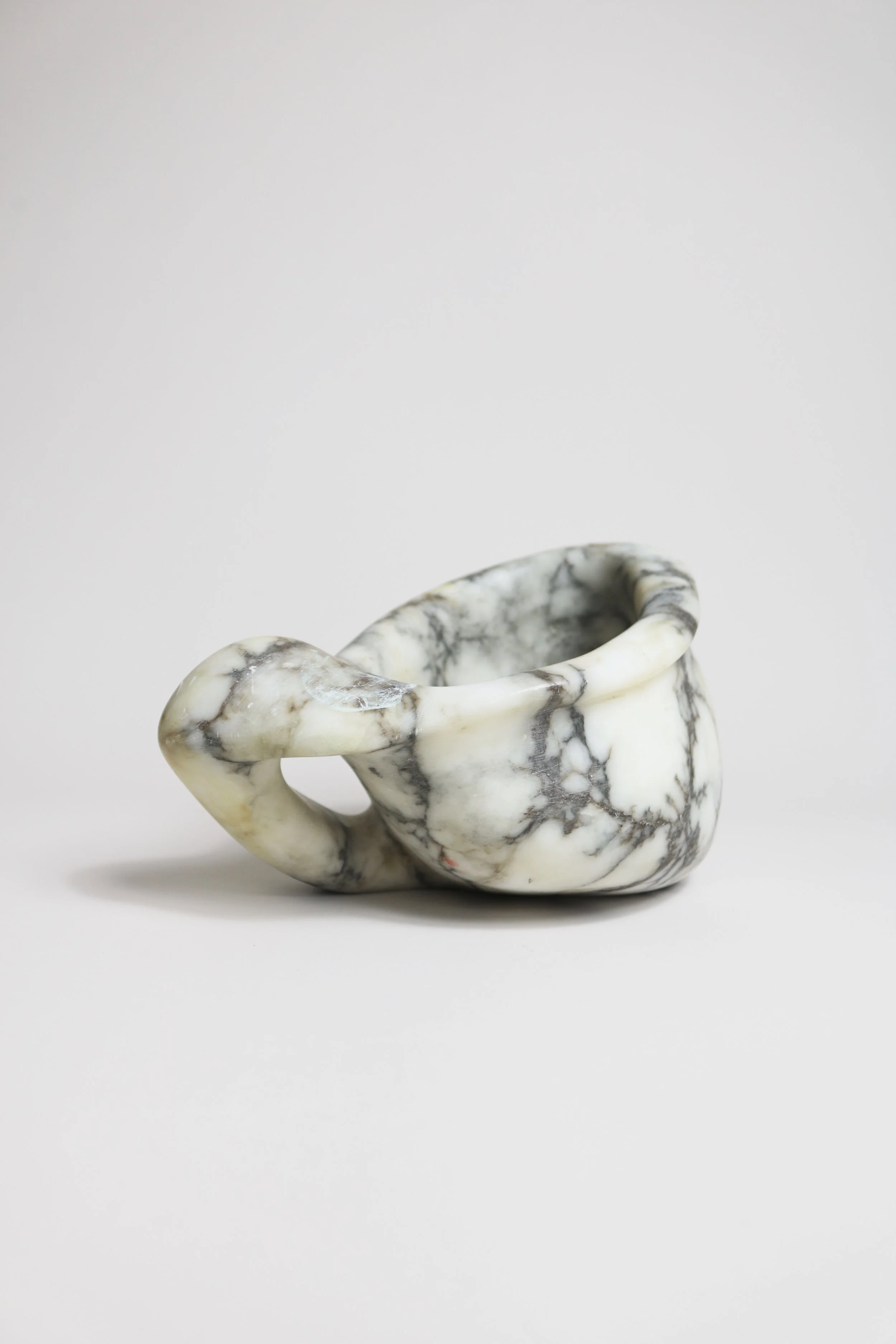 An asymmetric bowl carved from a block of Italian marble. A beautiful section of antique marble with irregular curves and a slanted base.