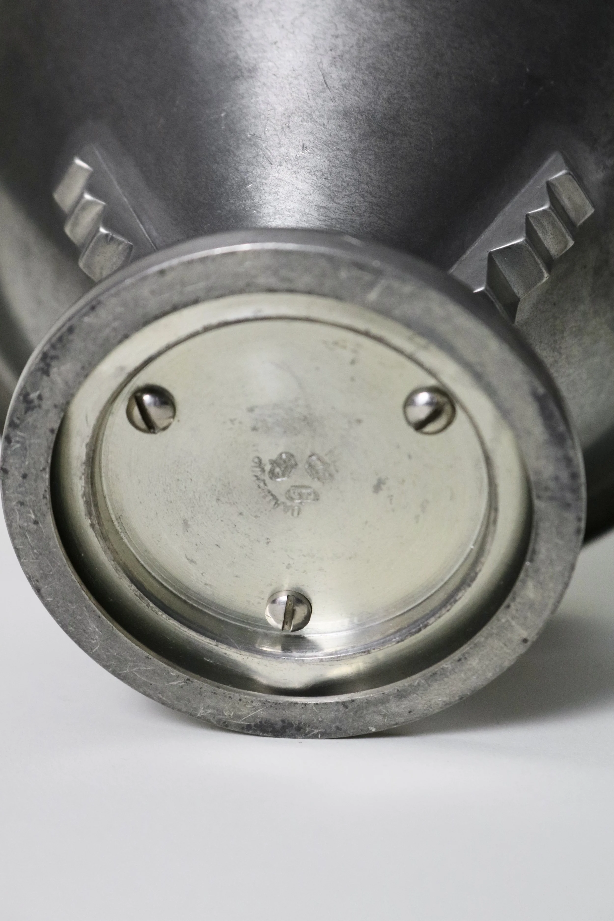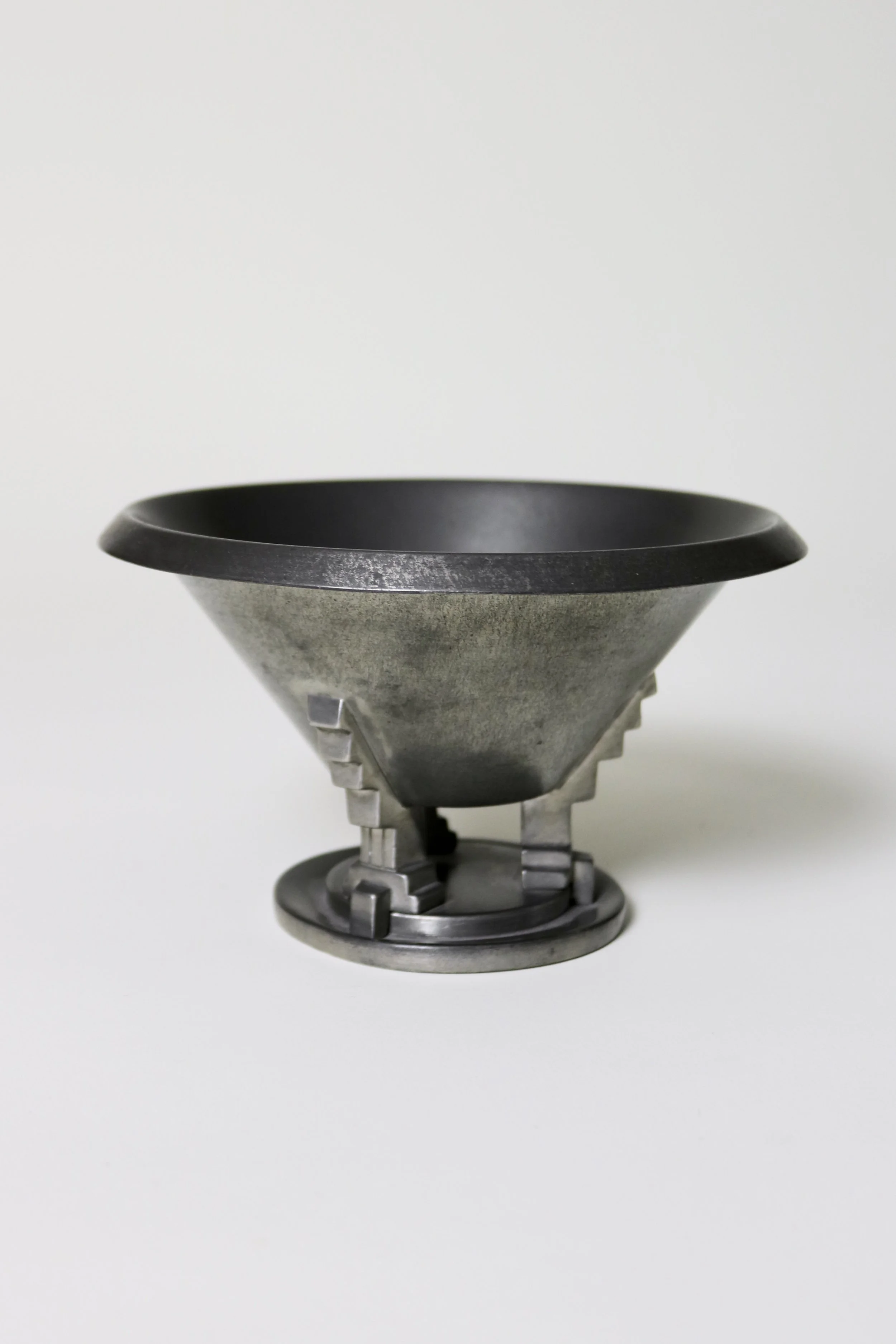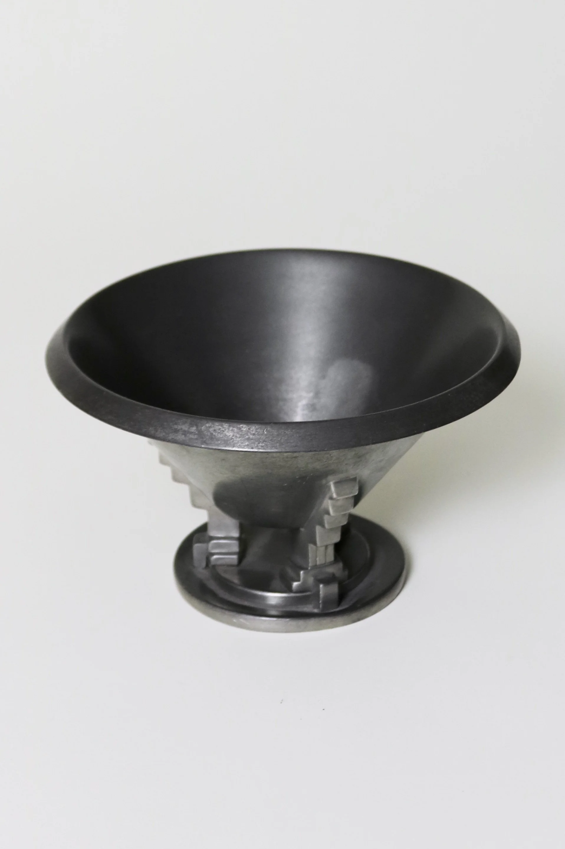 A pewter bowl with a stepped, geometric base and a smooth, flared rim.