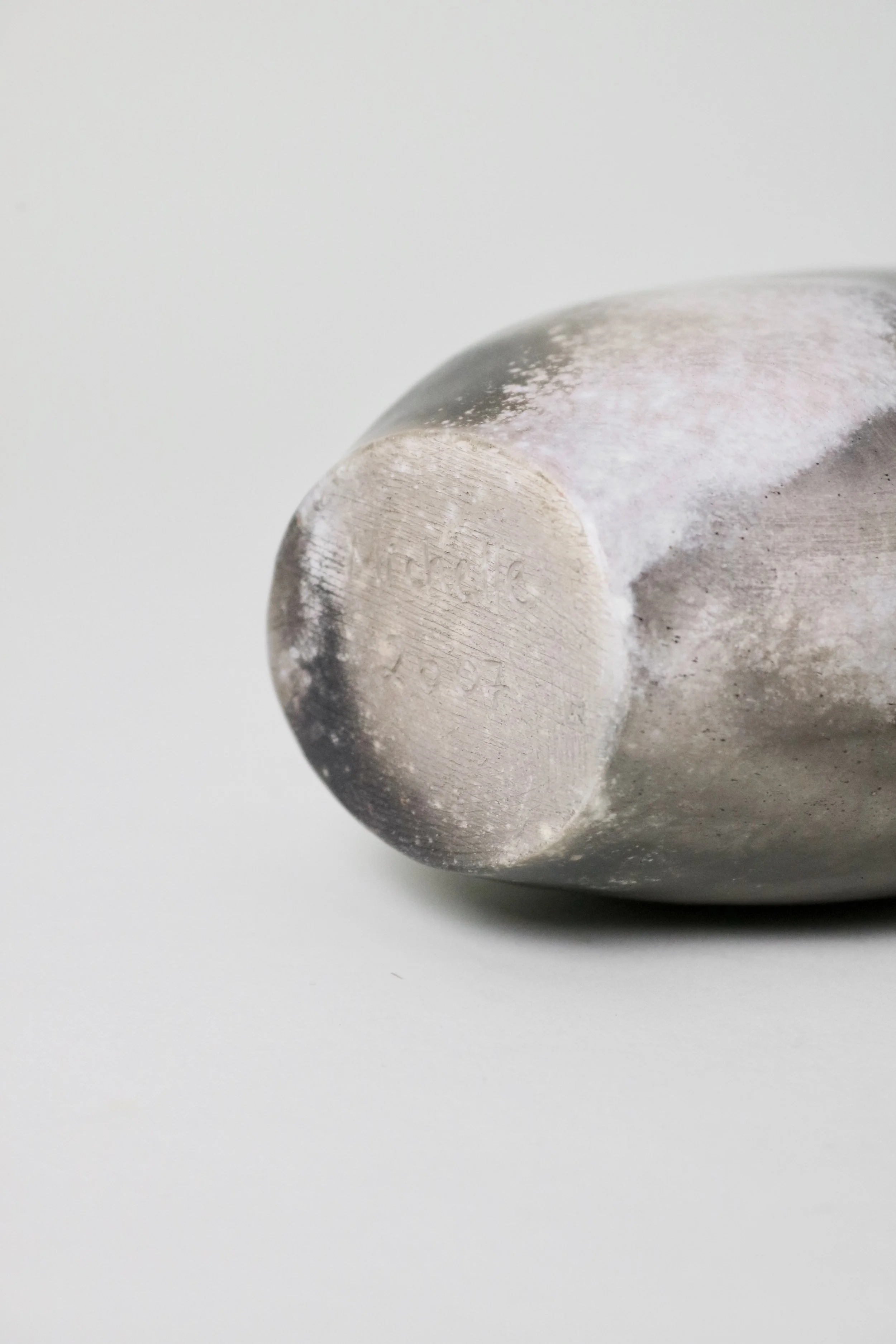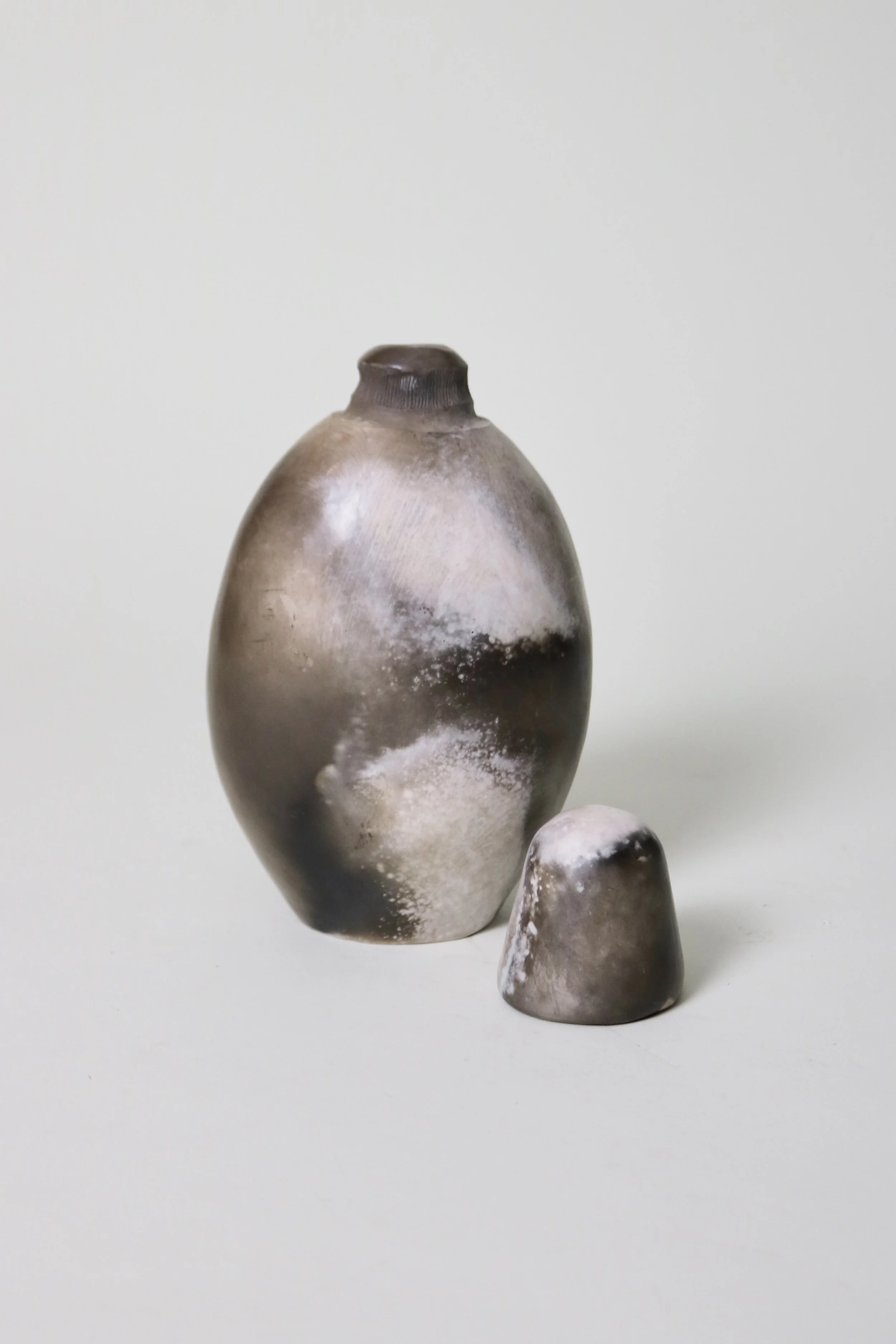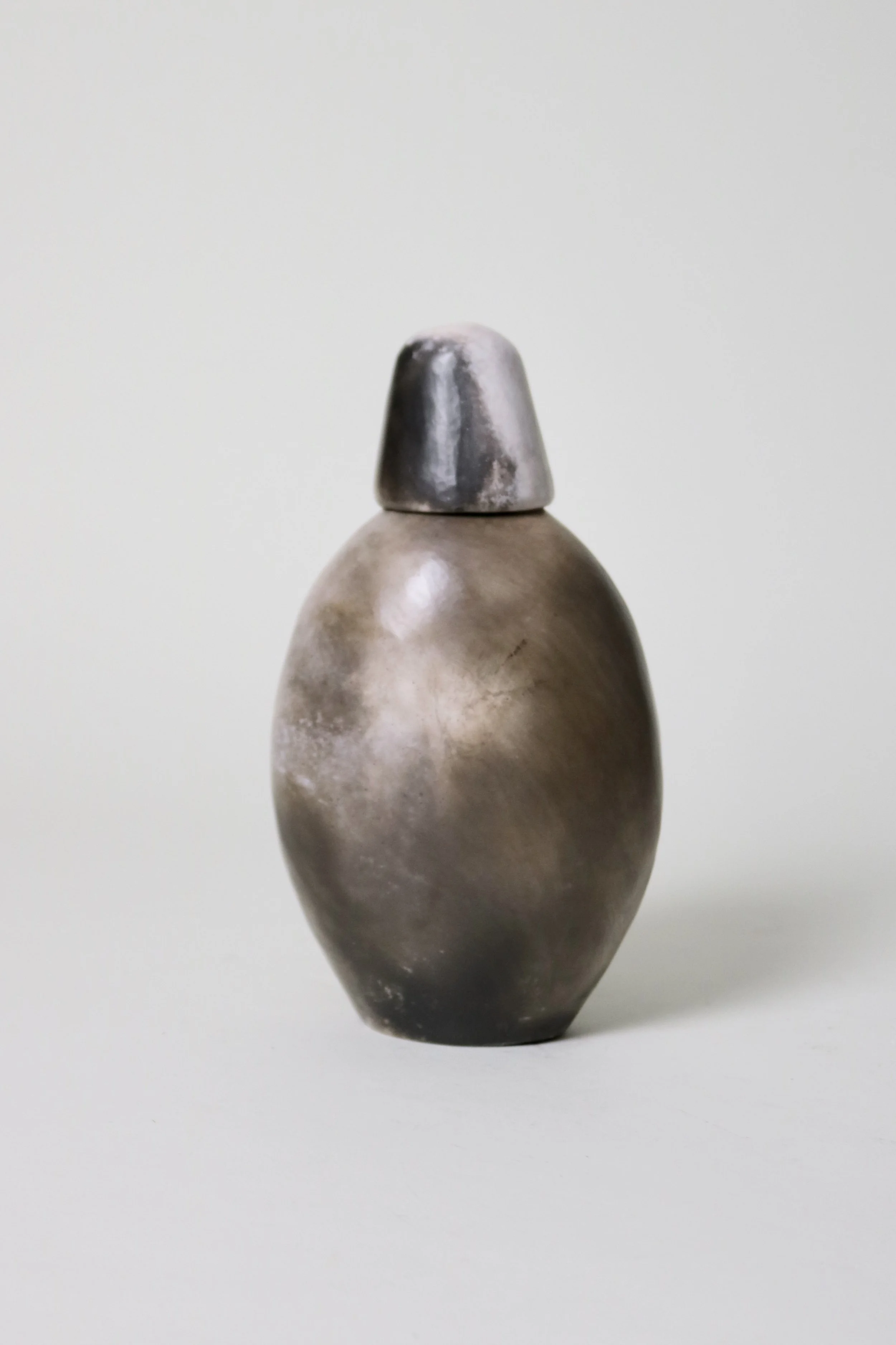 A naked raku bottle with a small lid, likely intended to be a sake bottle and cup. Made by a studio potter in the UK