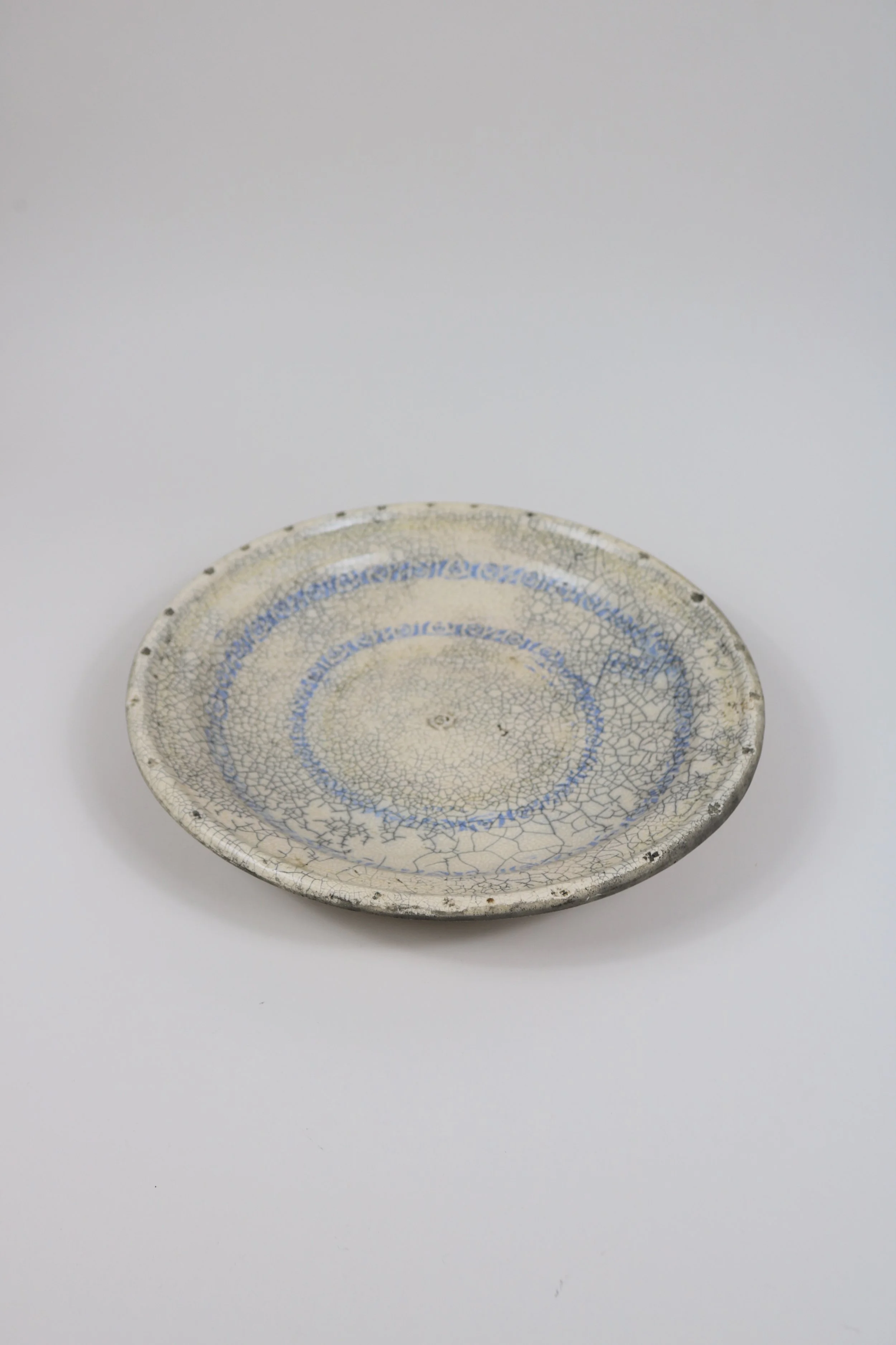 Naked Raku is a technique used to create spontaneous surface patterns on ceramic vessels. The crackled effect is formed by the drying of a ceramic slip applied to the surface whilst being fired. A skilful method of firing that creates unique results.