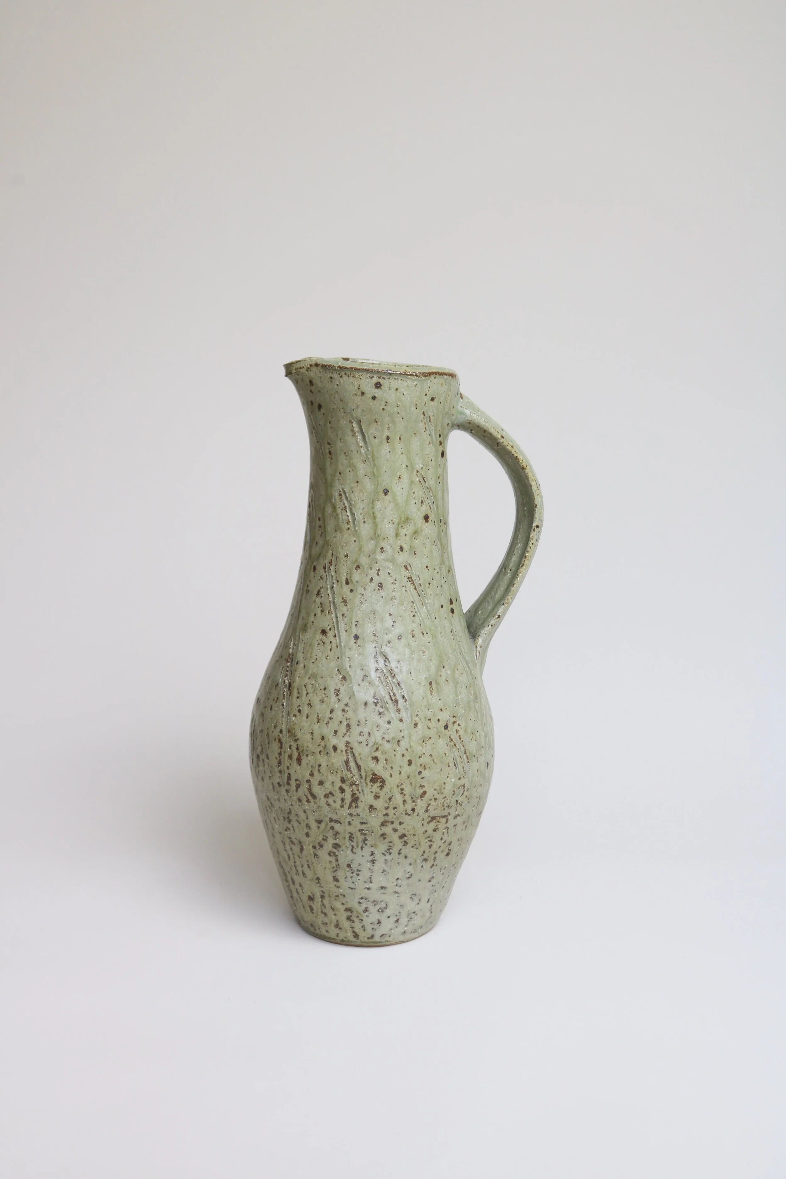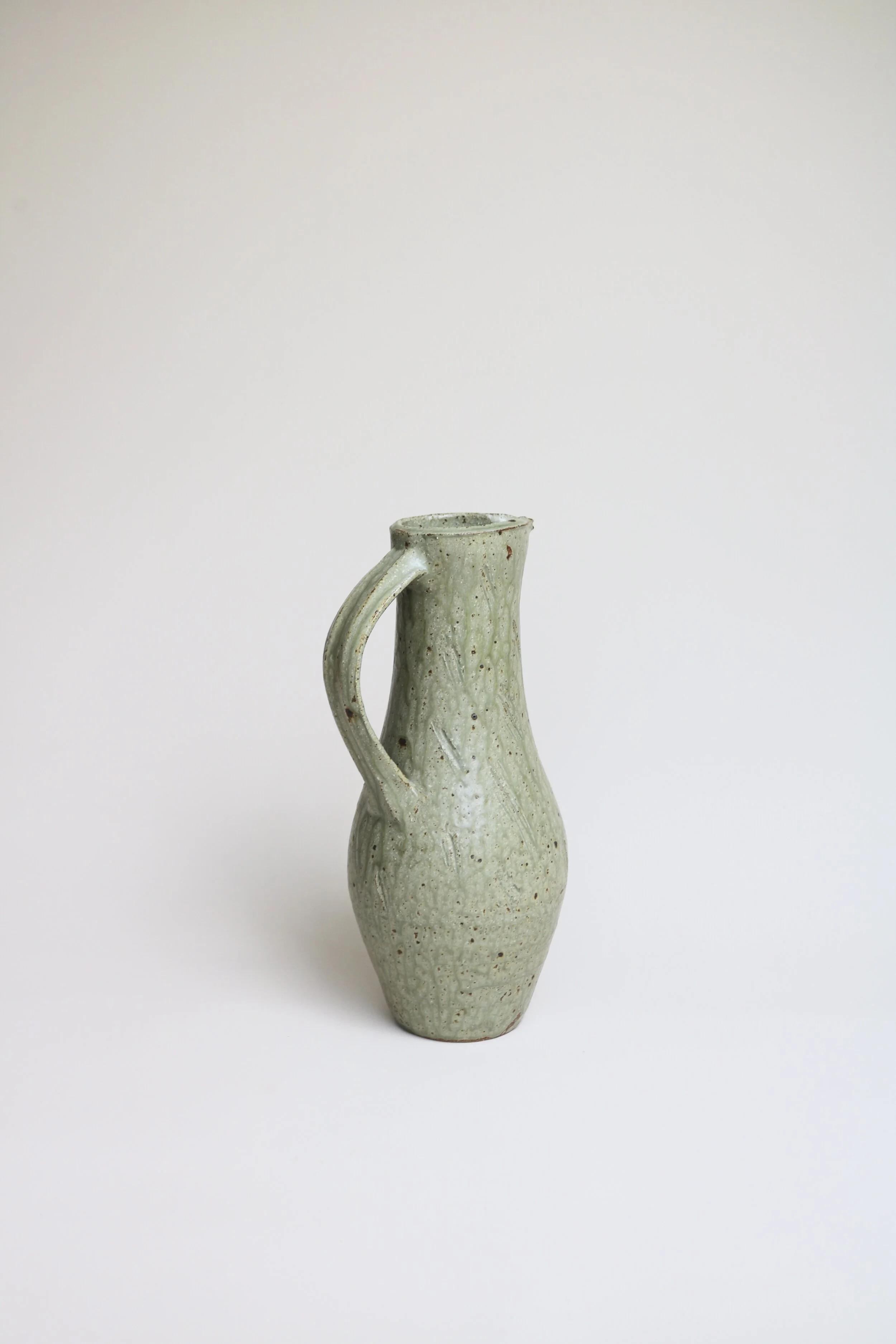 A tall salt glazed jug with a light green hue can be used decoratively or practically.