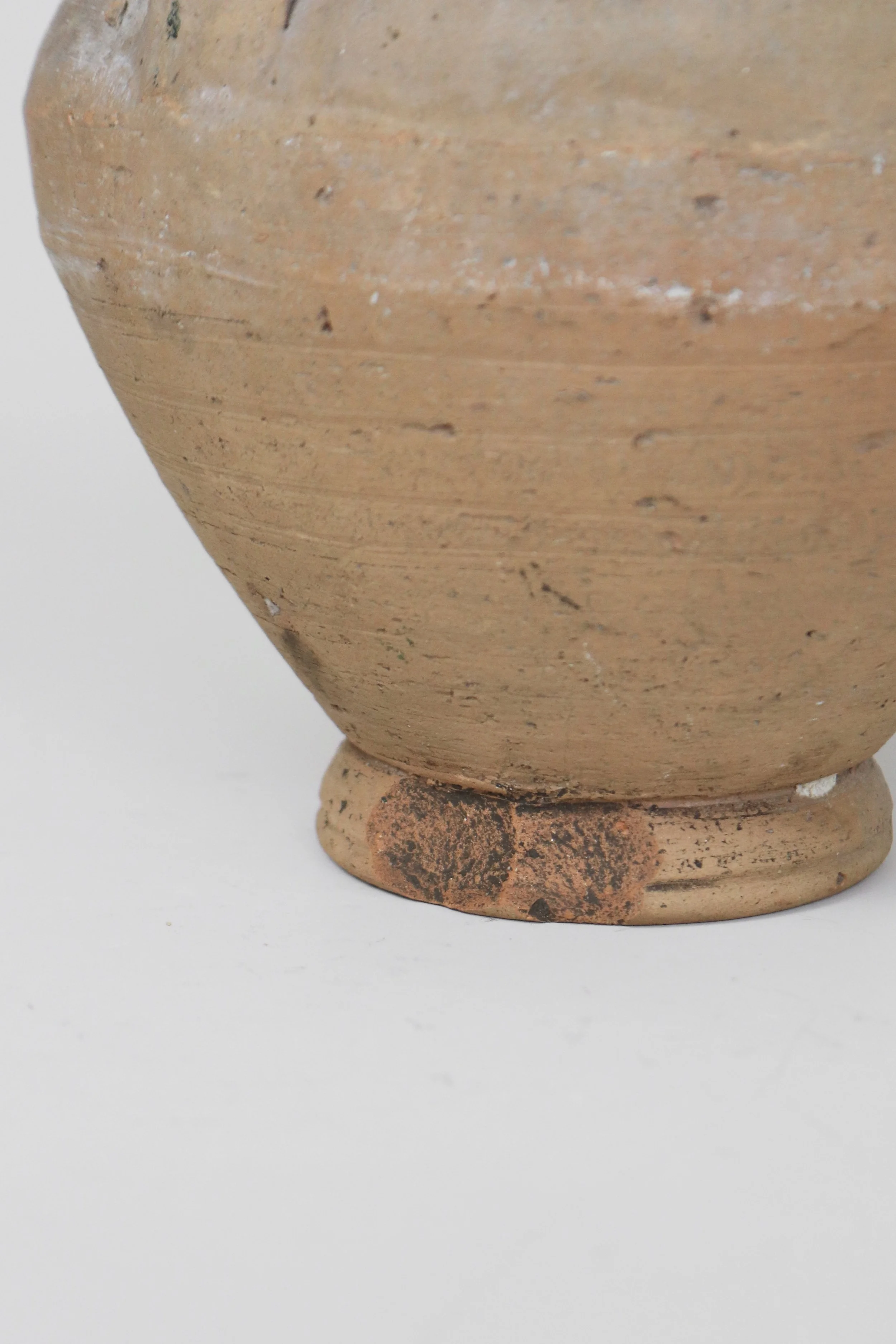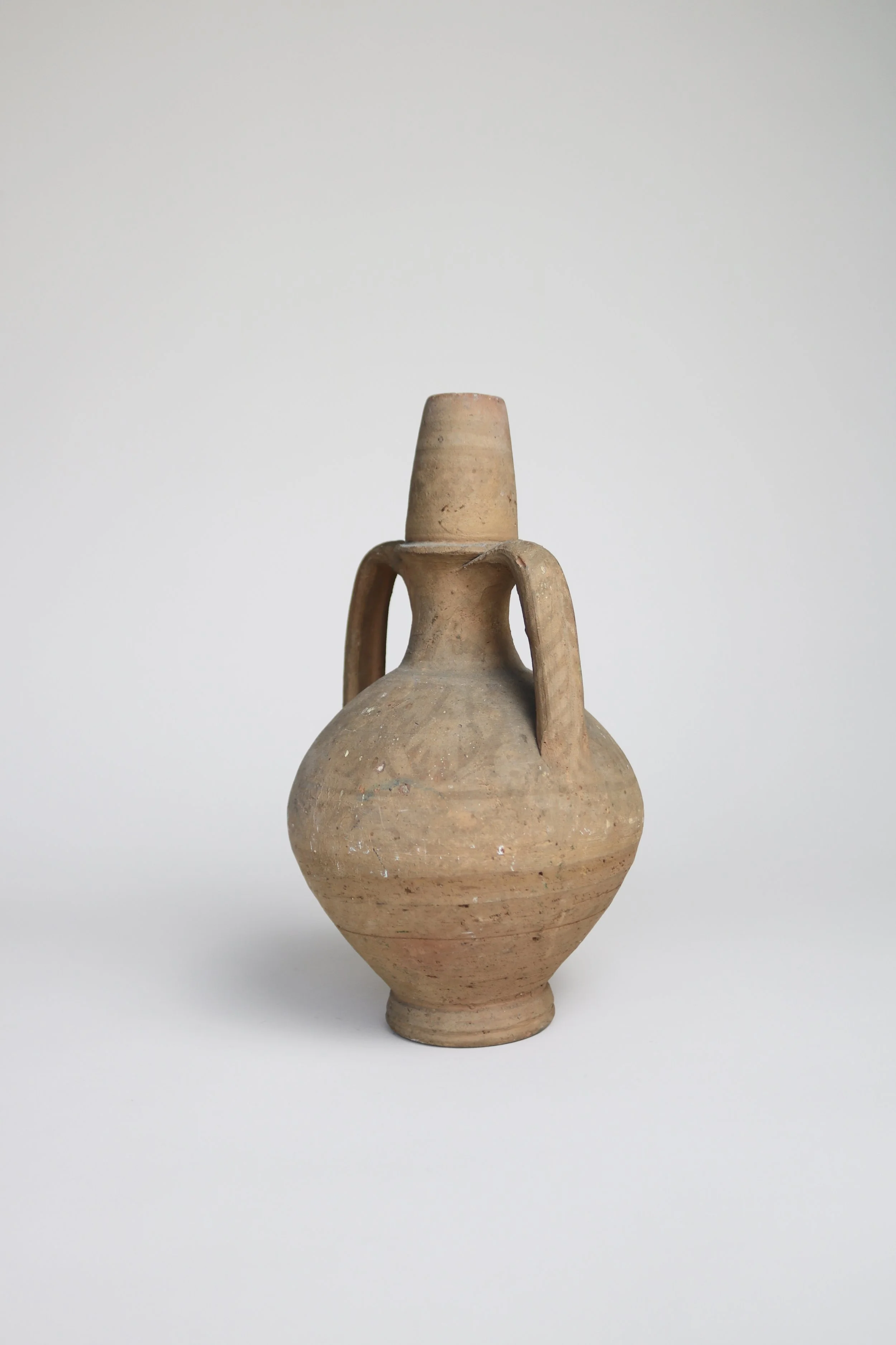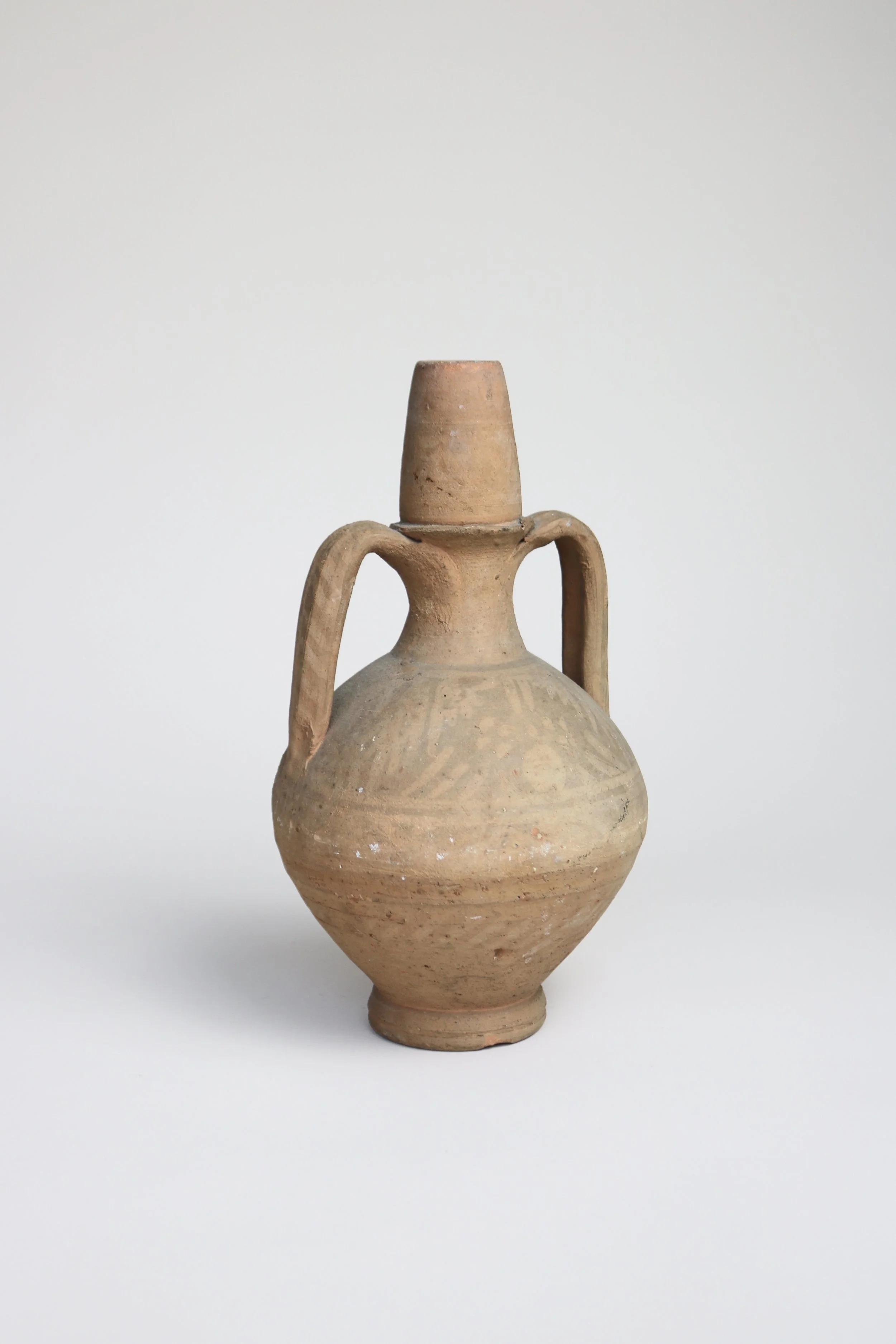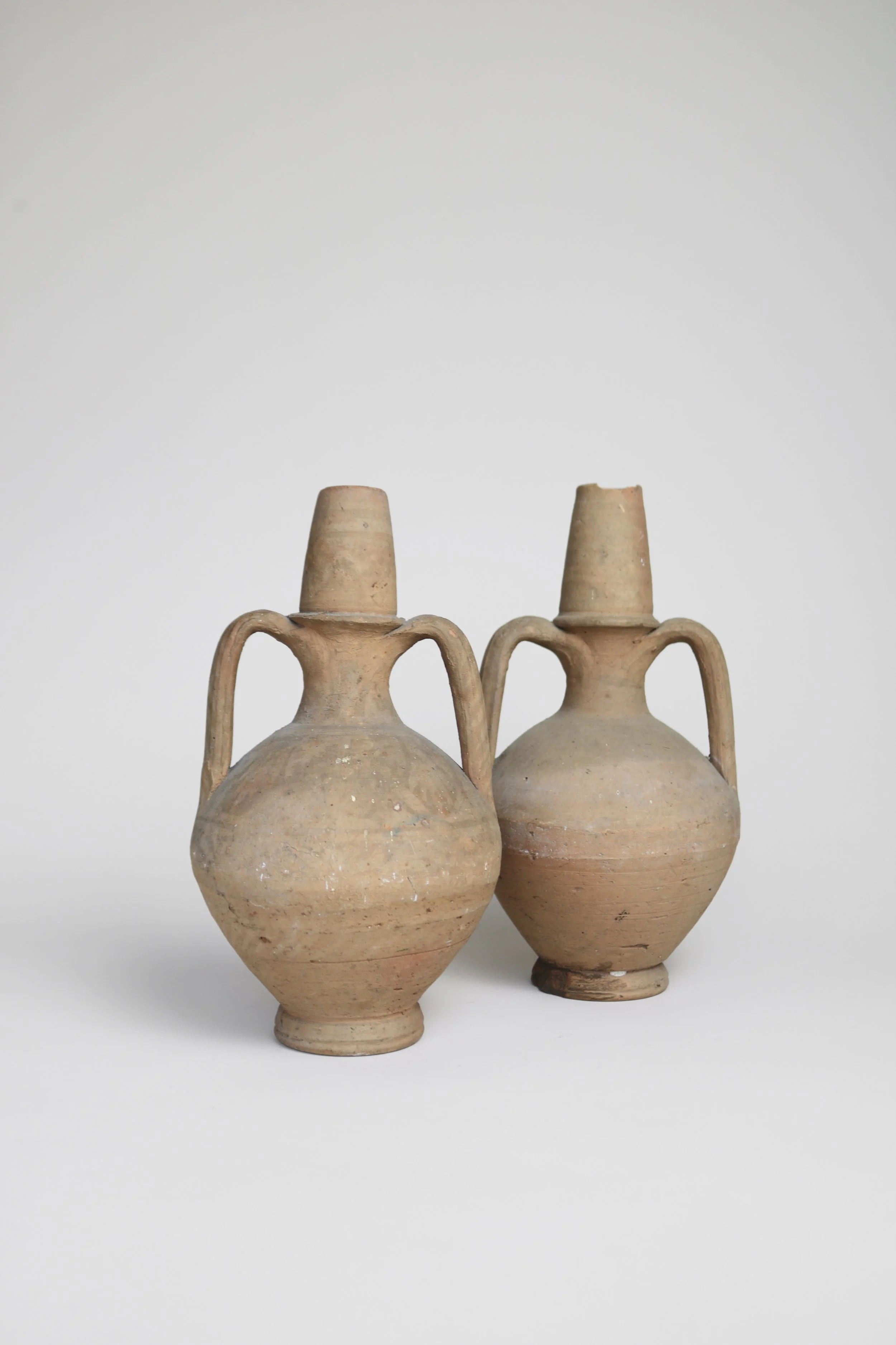 Two antique teracotta amphora. One has traces of a pattern and the other is plain. Both featuring an unusual elongated spout.
