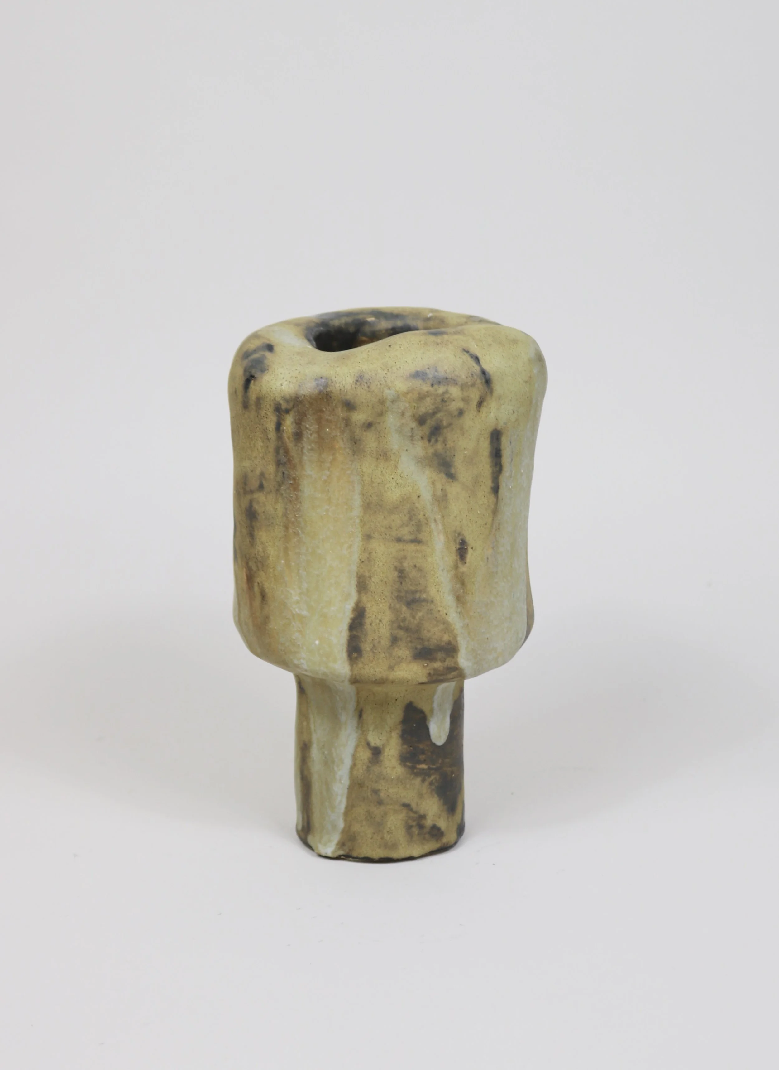 A top-heavy vase with a rock-like formation and dripped glaze. Made in Germany in the 1960s.