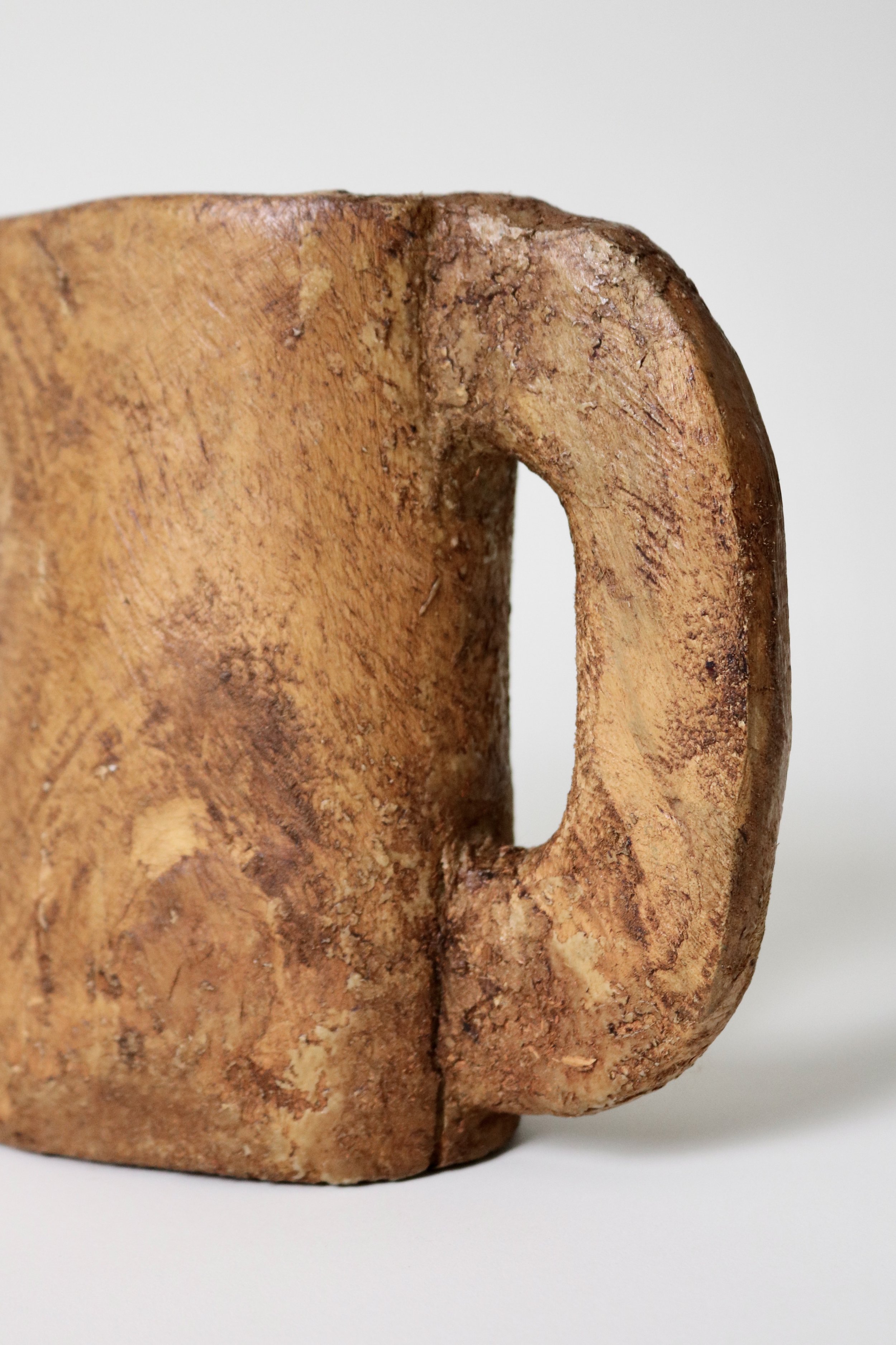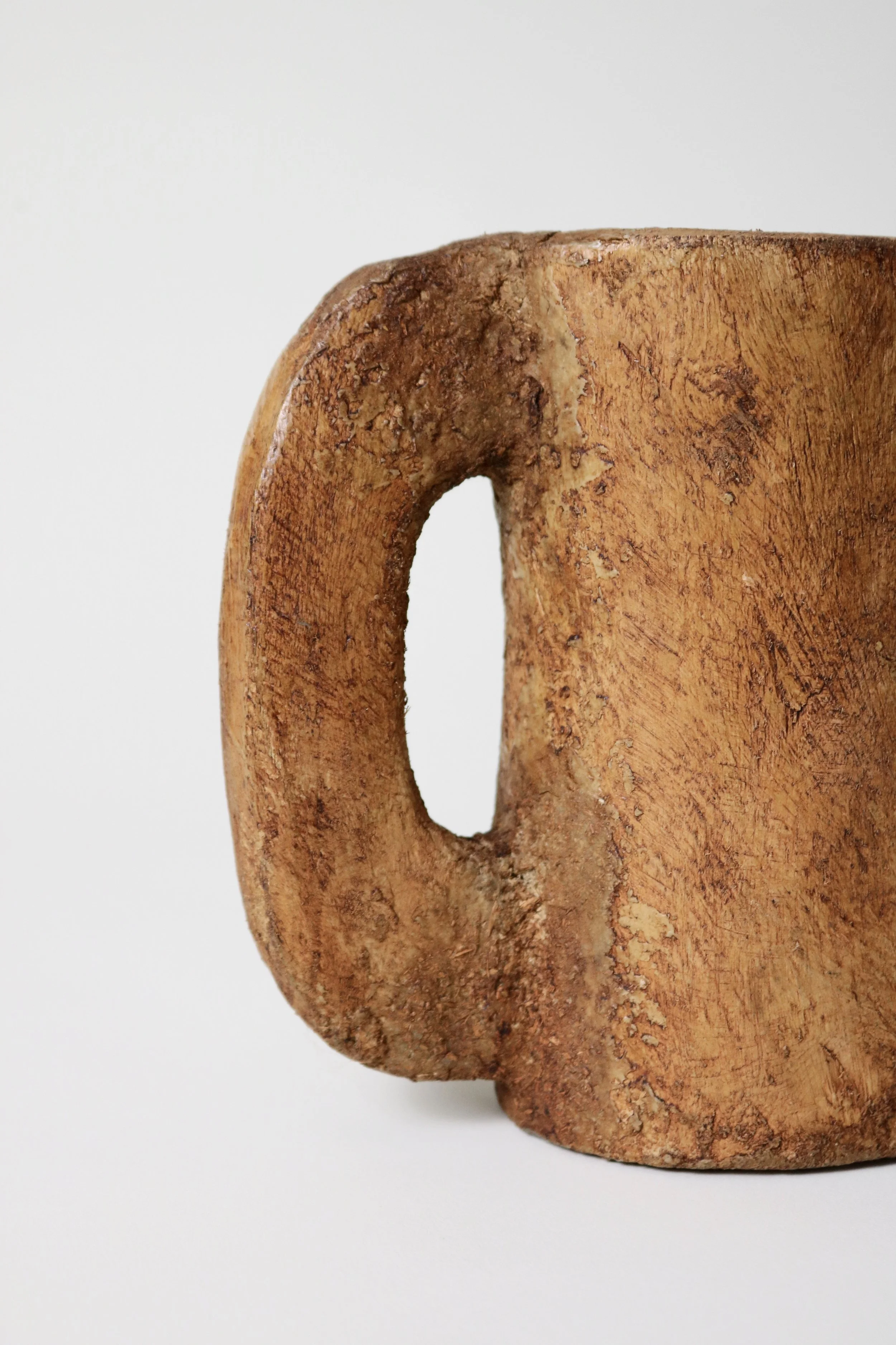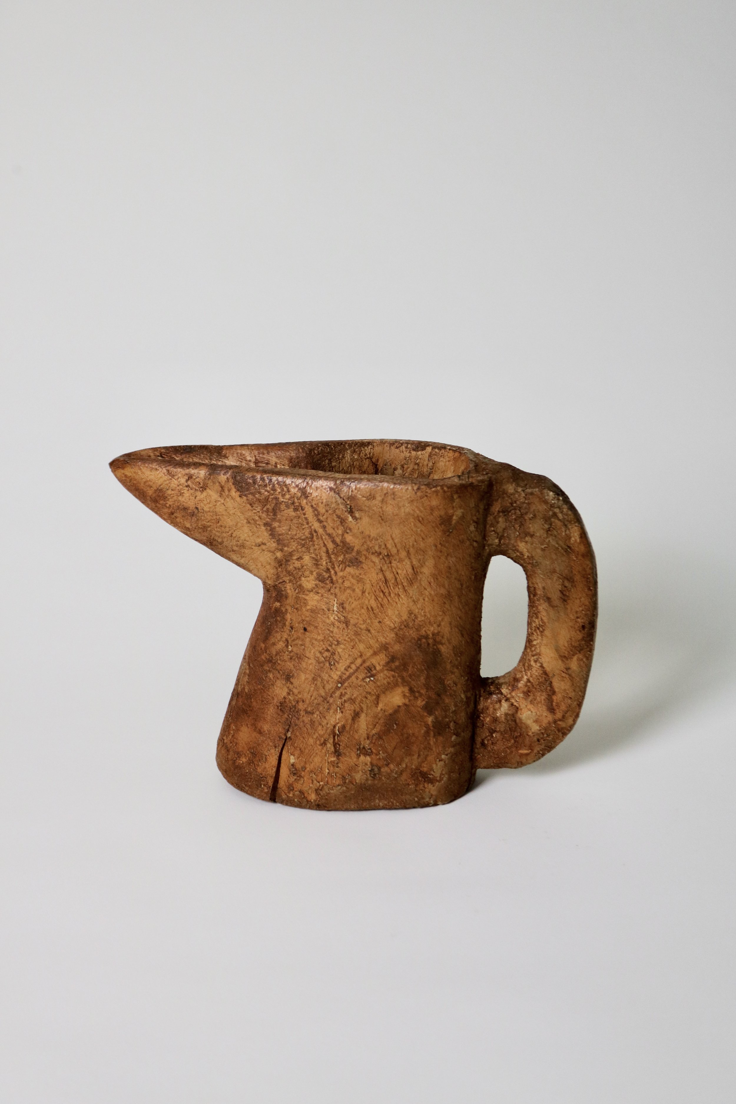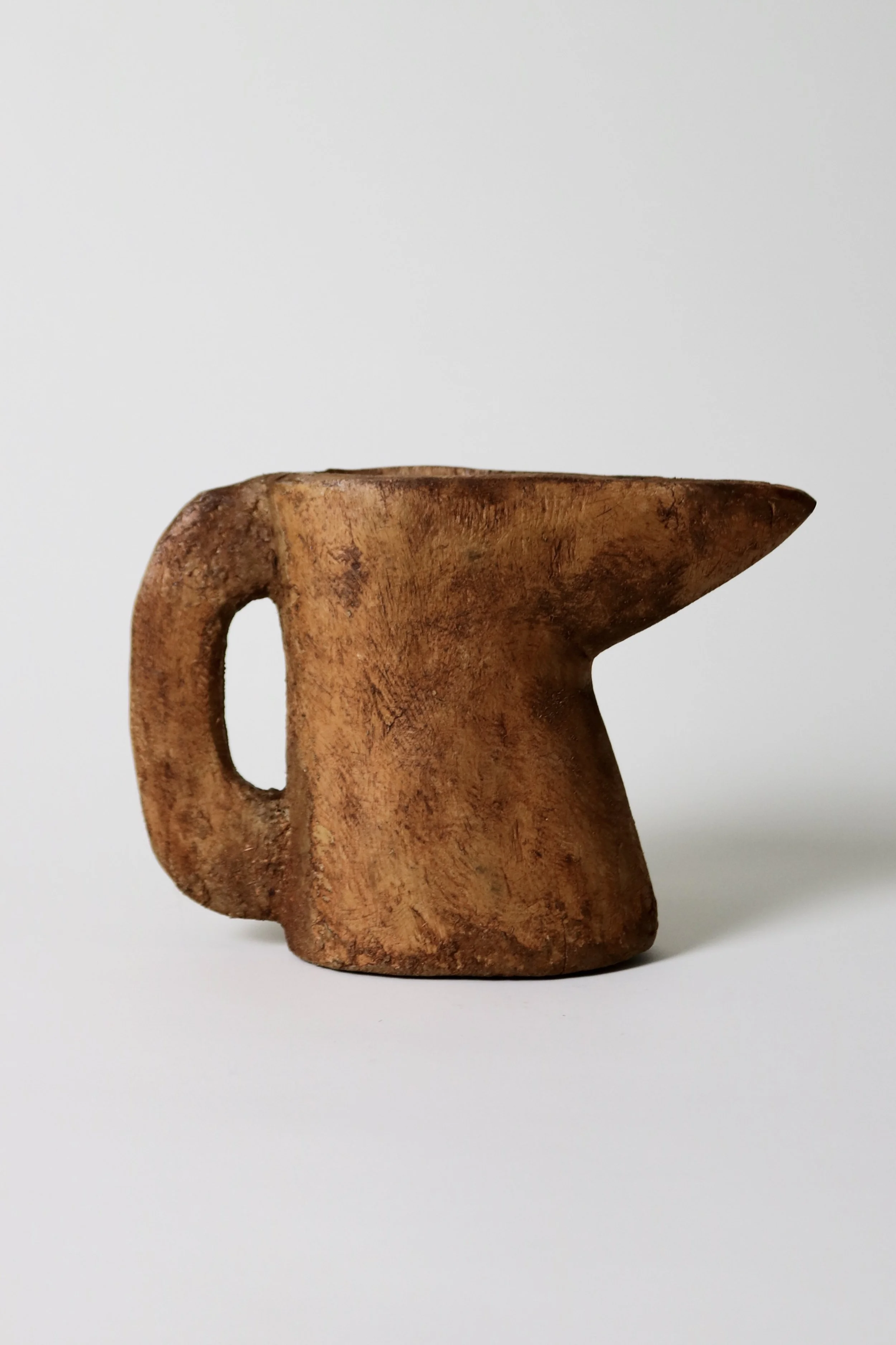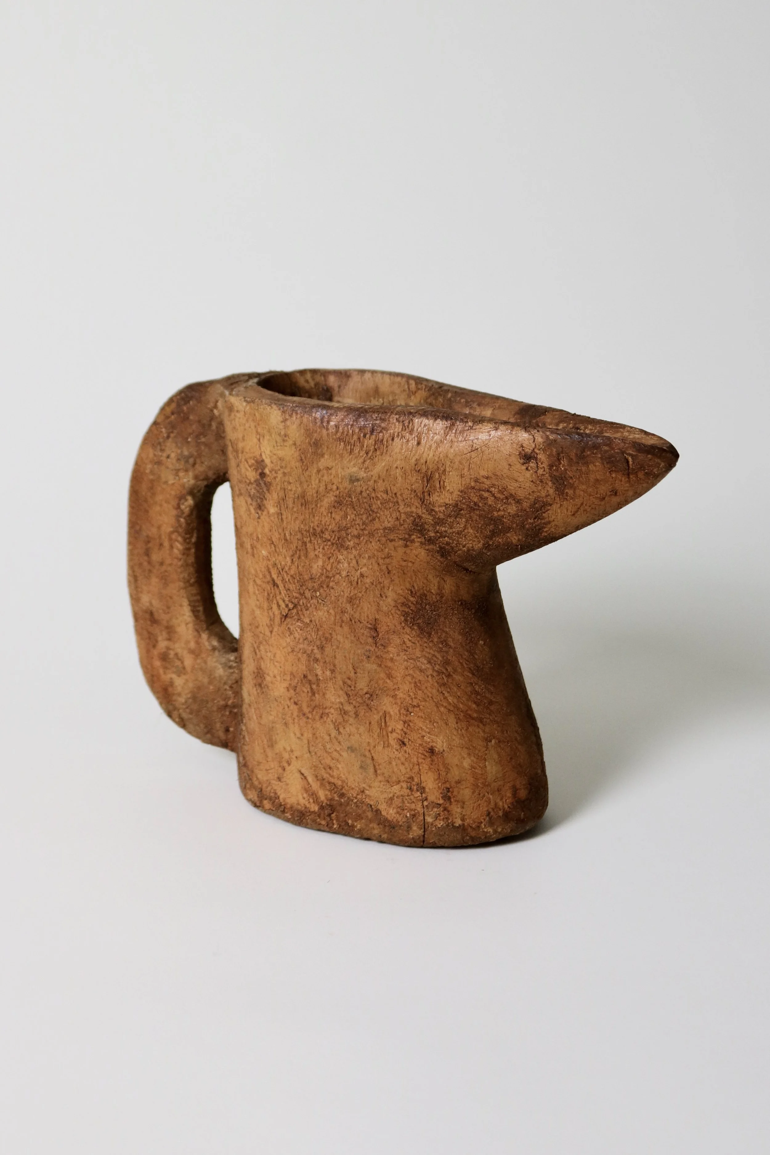 A carved wooden jug with an exaggerated spout. For decorative use.