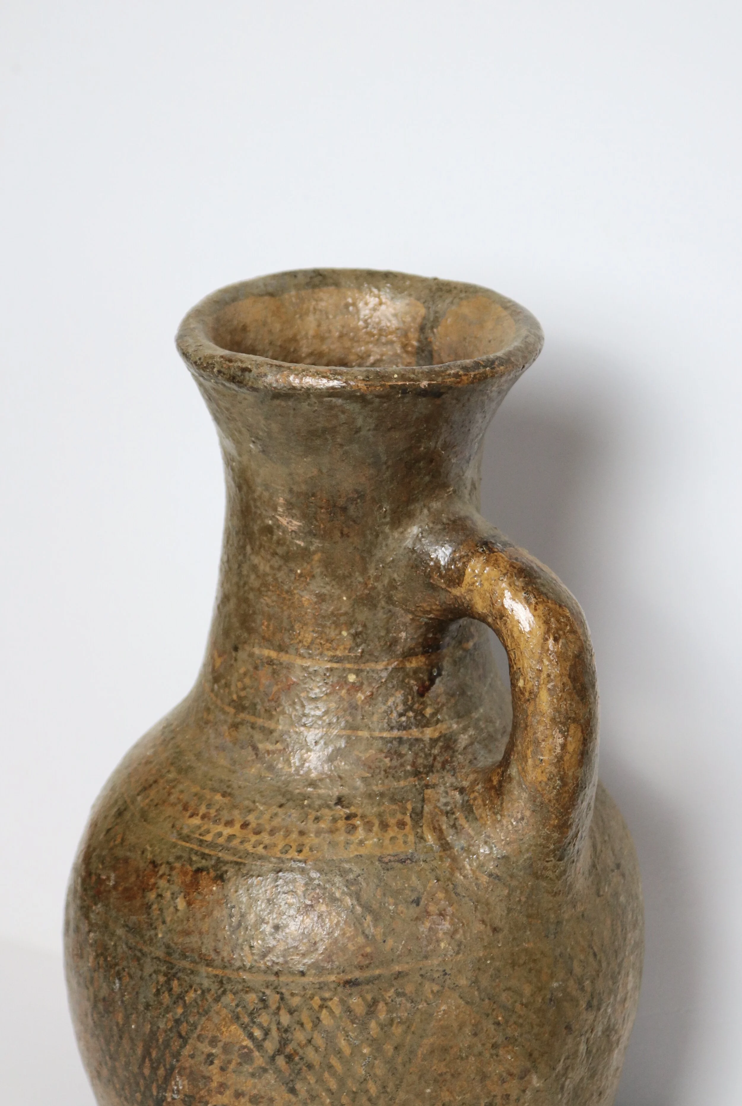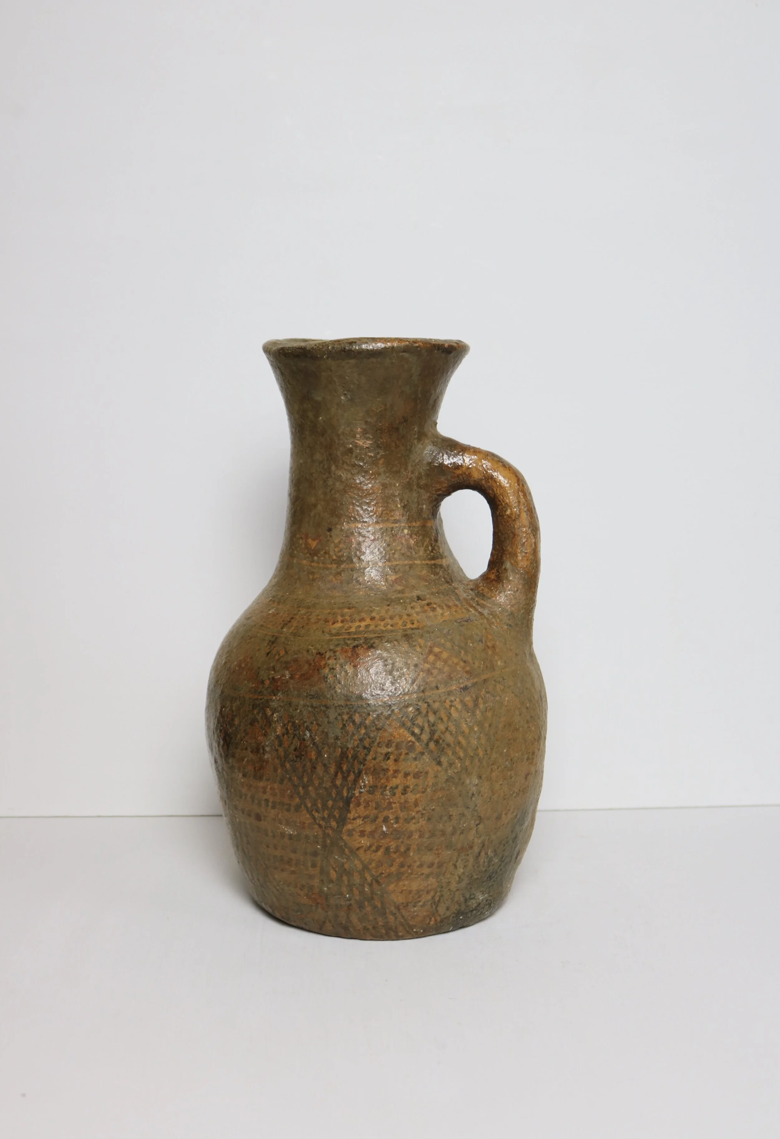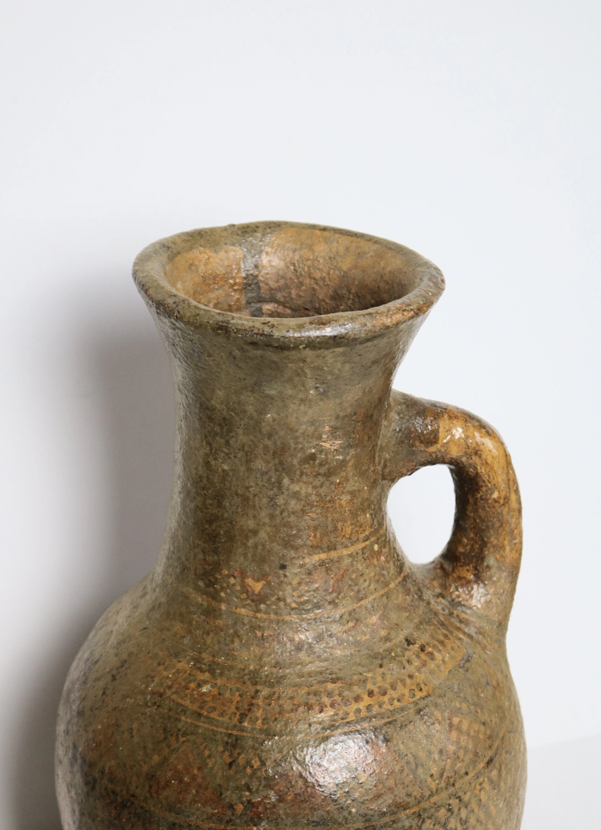 Avery large jug/vase most probably handmade from local clay dug by hand. The patterns on the vase would suggest it is African and most likely made for practical use as water or food storage.