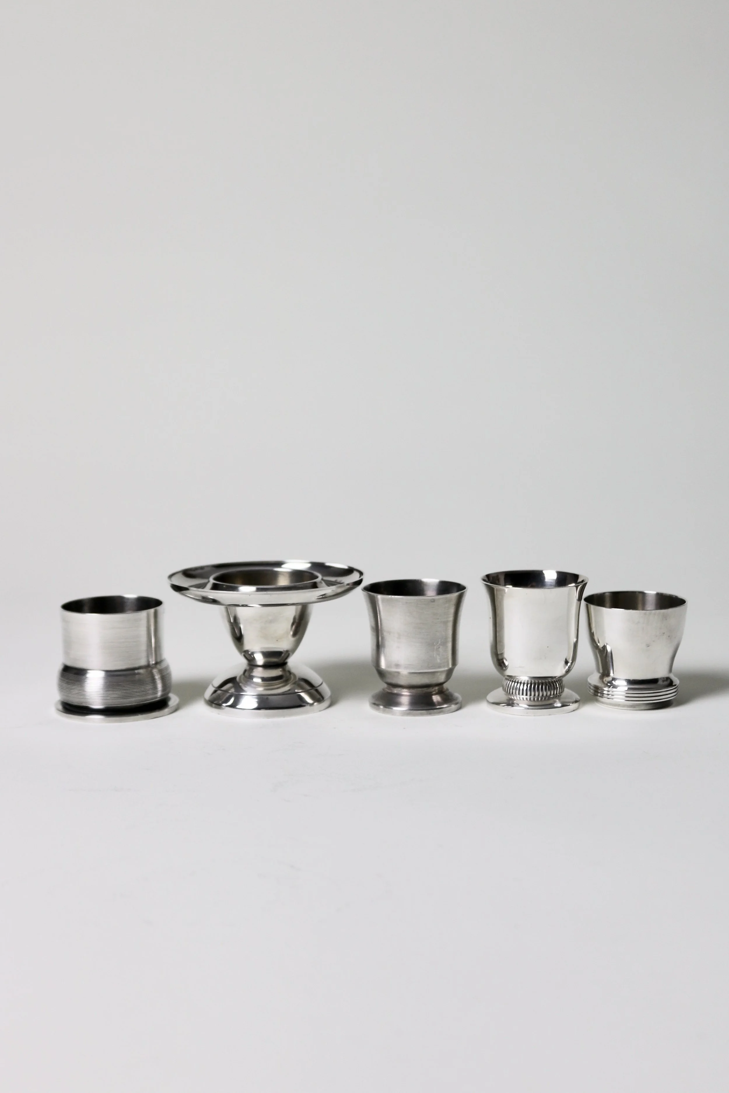 Sale › Silver egg cups Image 1 of 3 Image 2 of 3 Image 3 of 3 Silver egg cups Sale Price: £10.00 Original Price: £35.00 A selection of French silver-plated egg Cups. C1930sSold individually. 2 available. Style: 2 3 Quantity: Add To Cart Added! A selection of French silver-plated egg Cups. C1930sSold individually. 2 available.