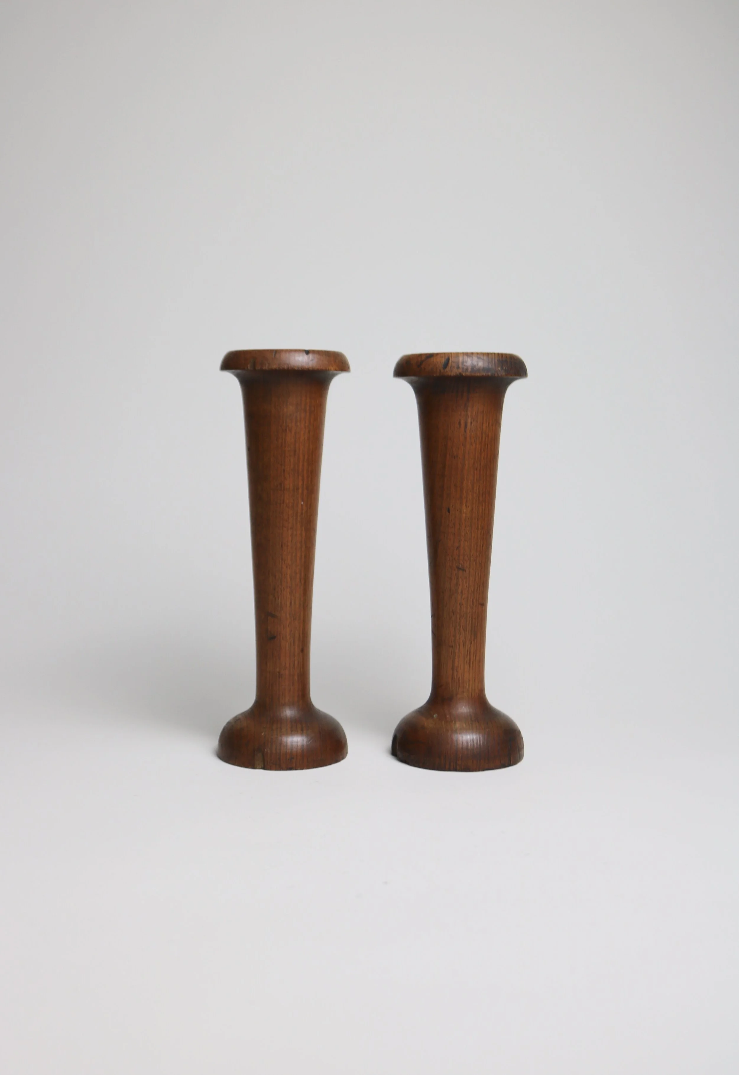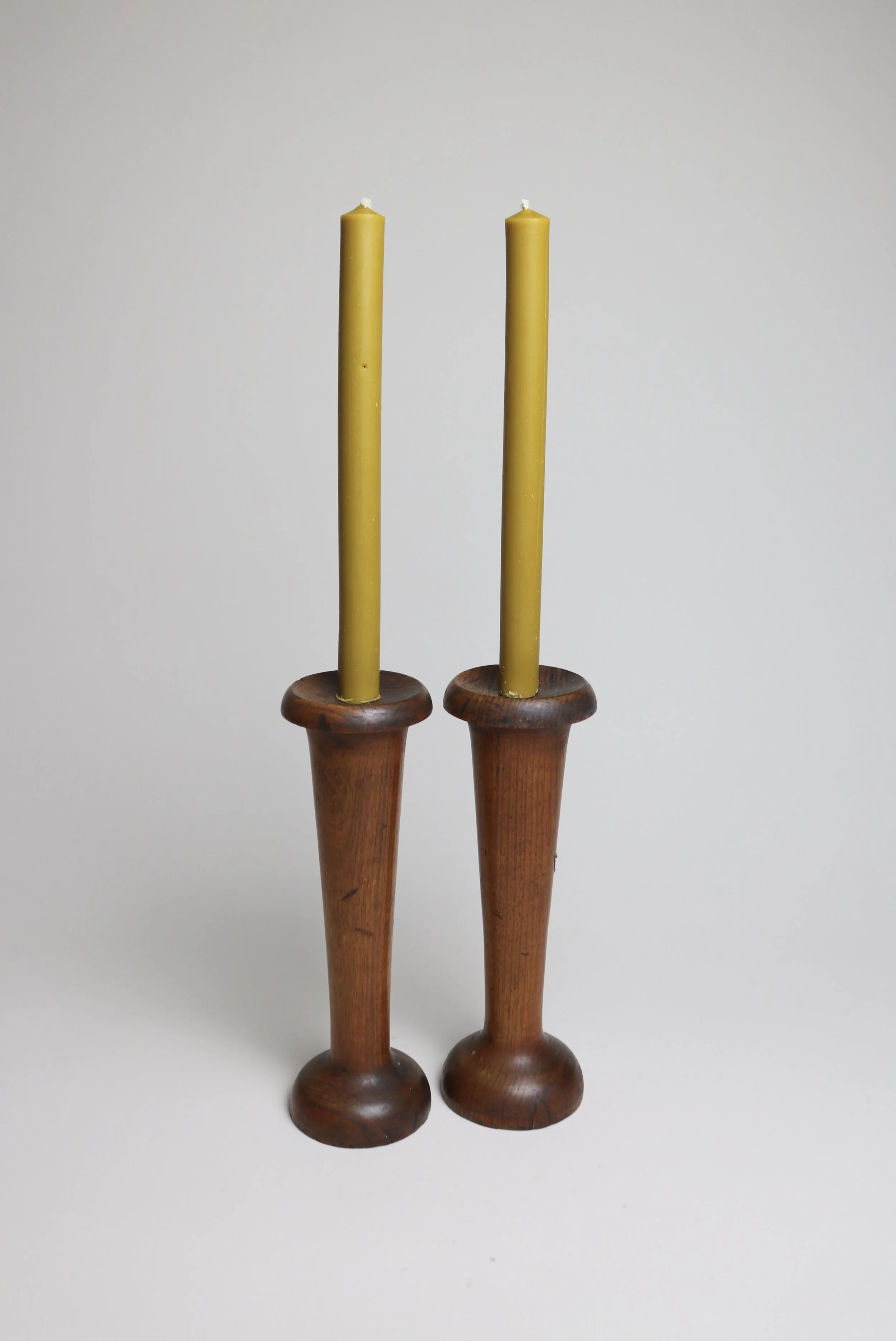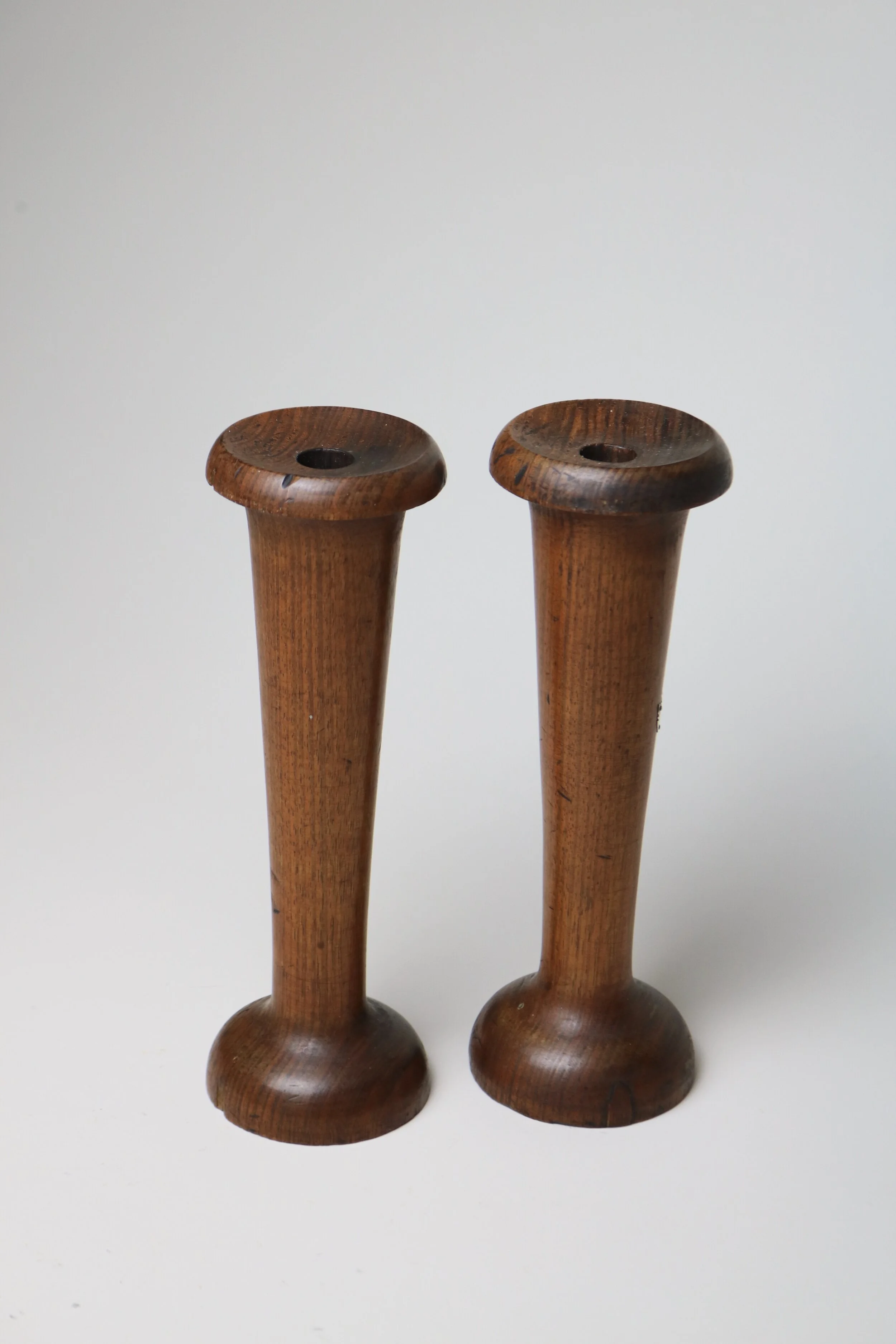 A pair of solid wood candlesticks made in the 1930s as souvenirs.